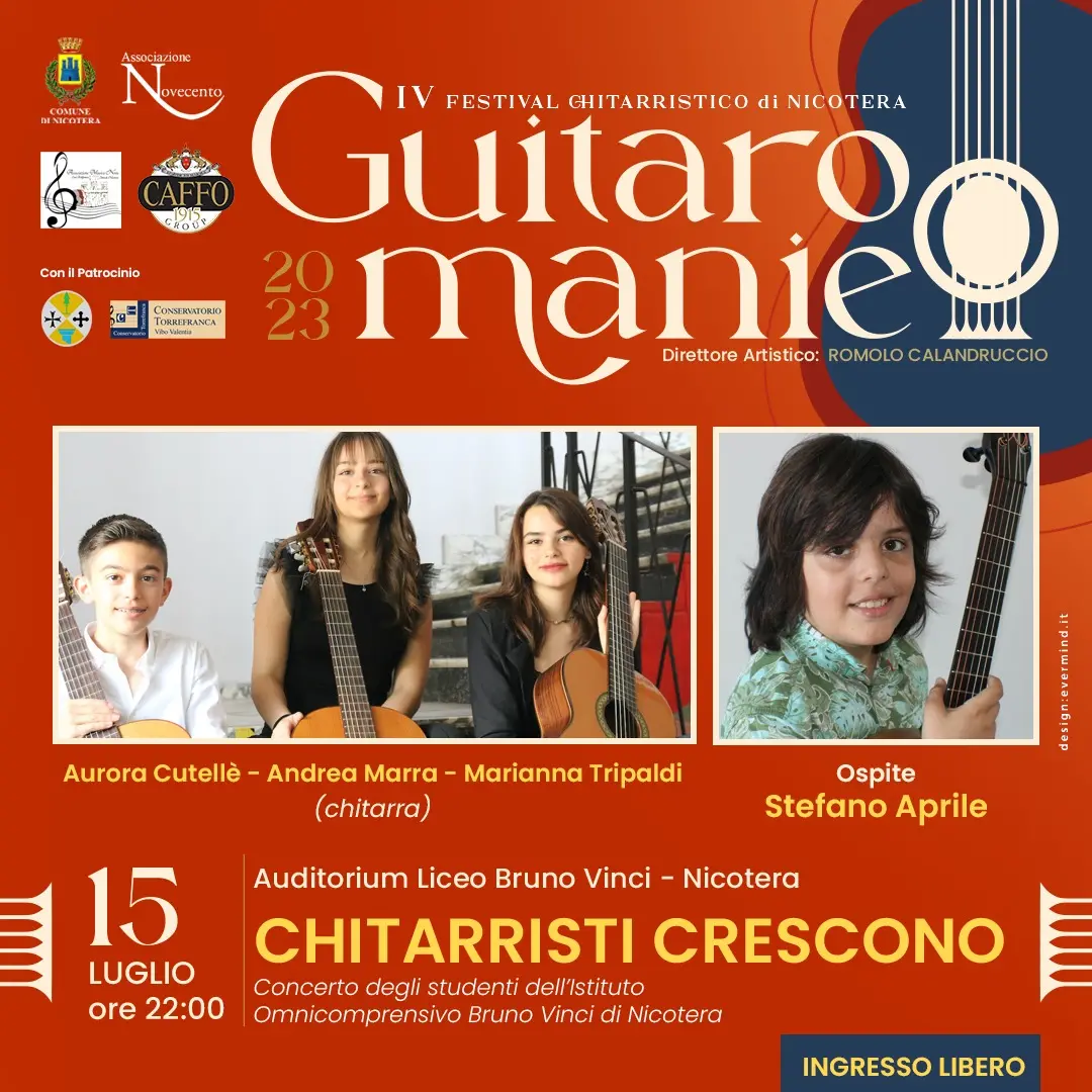 Il secondo appuntamento del Festival Guitaromanie avrà luogo il 15 luglio nell’auditorium del Liceo Bruno Vinci di Nicotera alle ore 22.00 con il concerto “Chitarristi crescono” e vedrà infatti come protagonisti alcuni giovanissimi chitarristi di Nicotera e Limbadi che hanno frequentato il corso di Strumento musicale dell’I.C. di Limbadi durante quest’anno scolastico (Chitarra: Belvedere Annunziata, Giannini Nicola e Clarinetto: Rocco Zinnà), due alunne del Liceo “B. Vinci” (Aurora Cutellé e Marianna Tripaldi), un alunno dell’ITIS (Andrea Marra) e un ospite proveniente da Catania (Stefano Aprile).