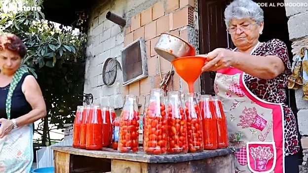 Le sorelle Immacolata e Francesca Capano di Dasà, piccolo centro in provincia di Vibo Valentia, mantengono vive nel tempo le antiche tradizioni, come quella della salsa di pomodoro. Un vero e proprio “rito” che si ripete ogni anno e accomuna decine e decine di famiglie: «Lo facciamo soprattutto per sapere cosa mangiamo e per il sapore che non è mai come la salsa comprata al supermercato», fanno presente.