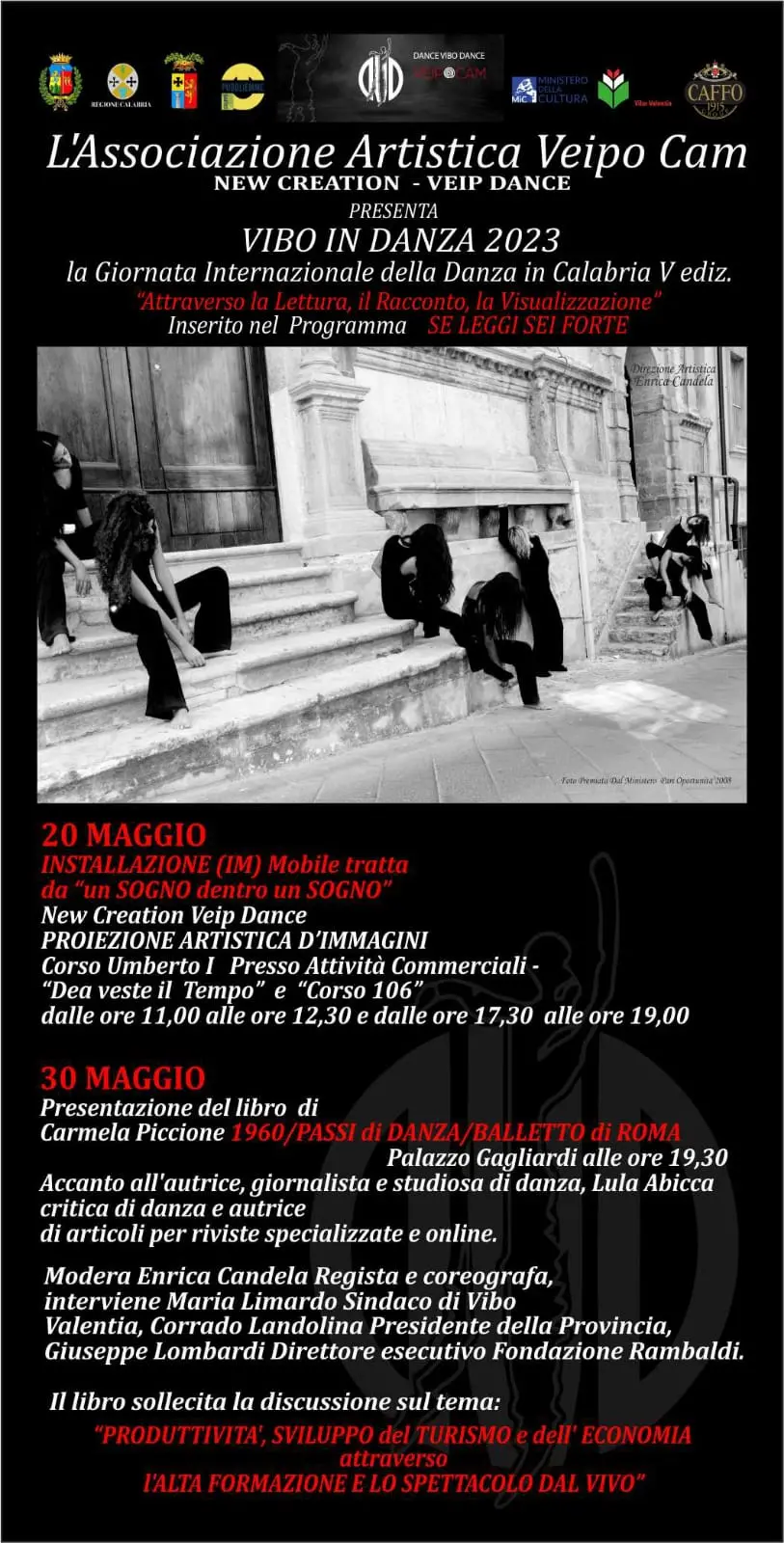 (Im) mobile, tratta da quadri dello spettacolo “Un Sogno dentro un Sogno” della New Creation Veip Dance, sarà realizzata da giovani professionisti calabresi, sotto la direzione artistica di Enrica Candela, ed avrà luogo il 20 maggio dalle ore 11,00 alle ore 12,30 e dalle ore 17,30 alle ore 19,00 su Corso Umberto I a Vibo Valentia, all’interno delle vetrine dei negozi Corso 106 e Dea veste il Tempo. Giorno 30 maggio, a palazzo Gagliardi alle ore 19,30, sarà presentato il libro 1960/Passi di danza/balletto di Roma. Il libro sollecita la discussione sul tema della produttività, dello sviluppo del turismo e dell’economia attraverso l’alta formazione e lo spettacolo dal vivo.