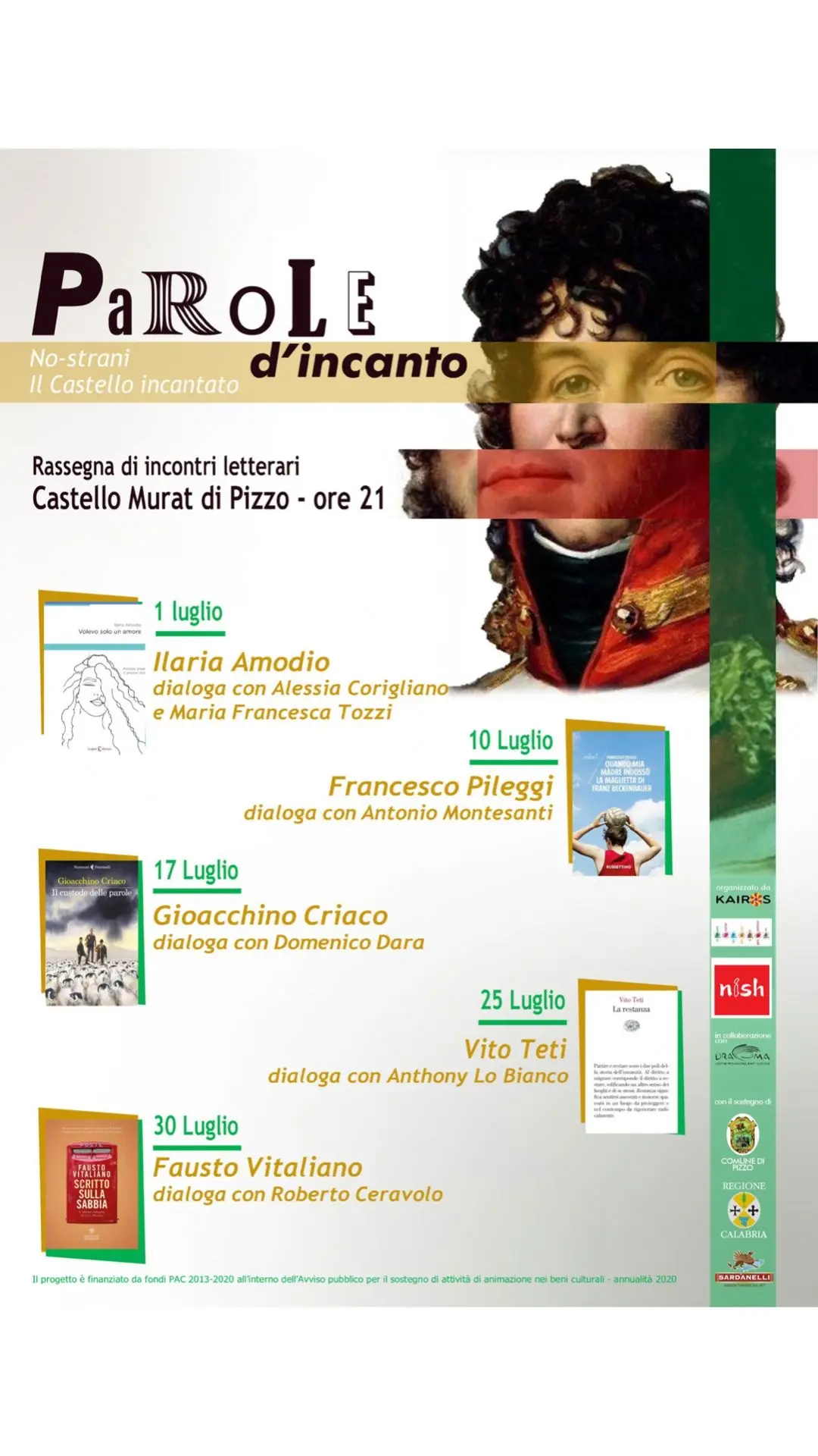 Tornano gli eventi letterari al Castello Murat di Pizzo. Per il quarto anno consecutivo, il sodalizio tra Cooperativa Kairos, associazione Nish e libreria Streusa ha messo su una rassegna con 5 presentazioni, che si inserisce nel più ampio progetto culturale “Il Castello incantato”, finanziato dalla Regione Calabria ed ideato da Kairos in collaborazione con l’associazione Dracma ed il Comune di Pizzo.