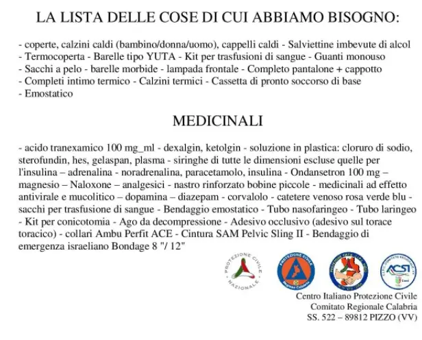 La raccolta è aperta a Pizzo, nella sede Prociv di via Anile, lunedì e mercoledì dalle 16.00 alle 18.00. Chi vorrà, troverà uno sportello dove vengono raccolti beni di qualsiasi natura. Tra i prodotti richiesti: coperte, calzini caldi sia per adulti che per bambini, termocoperte, guanti monouso, abbigliamento, medicinali. Simile iniziativa è stata anche promossa dal Comune di Parghelia, sempre in sinergia con la Prociv. Le donazioni di abiti, medicine, o materiale di primo soccorso, possibili sia contattando uffici comunali che la Protezione civile comunale.