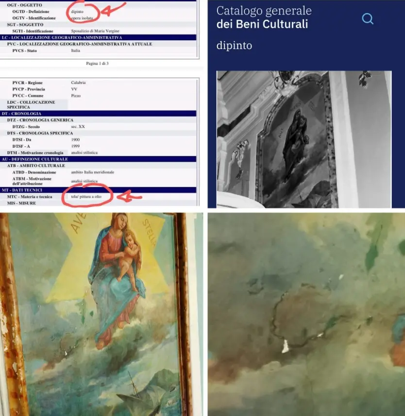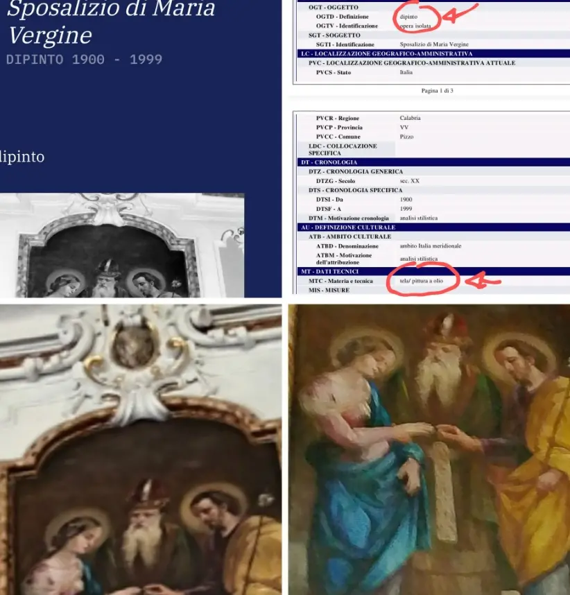 L’opera è collocata nella parte alta della parete della Chiesa della Madonna delle Grazie, «Confesso – spiega Montesanti – che mi sono fidato della descrizione della scheda tecnica realizzata per quell’opera da storici dell’arte, per l’Istituto centrale del Catalogo dei beni culturali, ente che fa capo al Ministero della cultura. Il Catalogo– tiene a precisare – è la banca dati che raccoglie e organizza a livello centrale le informazioni descrittive dei beni culturali di tutta Italia, frutto delle attività di ricerca condotte da diverse istituzioni sul territorio. Fortunatamente online sono consultabili una parte delle schede di beni fino a oggi conferite al Sistema informativo generale del catalogo: monumenti, collezioni, raccolte, oggetti di interesse artistico e storico, reperti e siti archeologici, beni scientifici e naturalistici. Tra cui risultano due delle opere realizzate per quella parete. Tra queste, lo Sposalizio della Vergine. Ebbene nella scheda entrambi figurano come “dipinti ad olio su tela”».