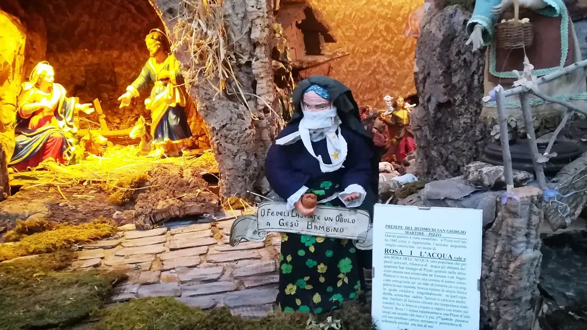E così don Pasquale Rosano, parroco di San Giorgio, preparando il Presepio nel Duomo a Pizzo, ha messo la mascherina a “Rosa ‘i l’acqua”, una delle statuine più celebri della scena natalizia. Essa, per chi ancora non la conoscesse, rappresenta una popolana vissuta nella prima metà del secolo scorso che abitava proprio nei pressi del duomo e che per pochi spiccioli riforniva di acqua gli abitanti del quartiere, quando ancora le case erano sprovviste di fontane e bisognava approvvigionarsi in quelle pubbliche.