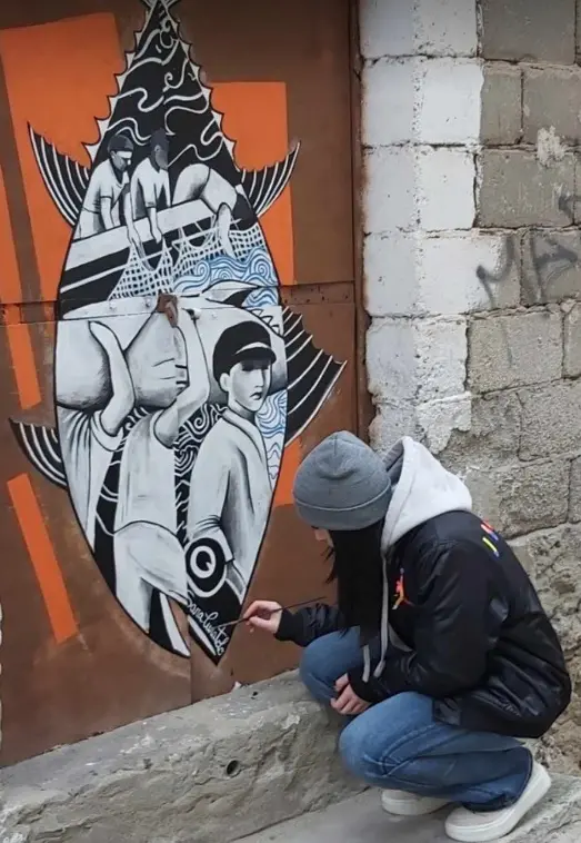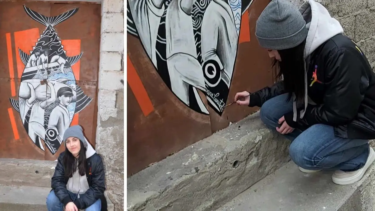 Nata a Vibo Valentia 25 anni fa, Sara Curatolo ha conseguito il diploma al liceo artistico “Colao” di Vibo e la laurea triennale in pittura all’accademia di belle arti di Brera a Milano. Opera nel campo delle arti visive abbracciando diversi media artistici: pittura, disegno digitale, incisione, fotografia: «L’opera – ci spiega- nasce grazie al progetto ‘Porte d’artista’ di Massimo Sirelli con il quale ho avuto preziosissimi confronti al fine di realizzare un murales che racchiudesse la storia della tonnara di Pizzo. Il lavoro – aggiunge – è il frutto di uno studio fatto su foto storiche rappresentanti l’antica lavorazione del tonno al fine di raccontare la dedizione e il duro lavoro con il quale intere famiglie hanno contribuito a produrre ricchezze e memorie per il paese». L’adesione all’iniziativa «per me ha rappresentato un’opportunità di crescita». E non solo: «Il progetto – chiosa la 25enne – mi ha dato modo di arricchire le conoscenze sulla storia del paese ma soprattutto mi ha regalato confronti indispensabili per l’evoluzione dell’opera e del messaggio che vuole comunicare».