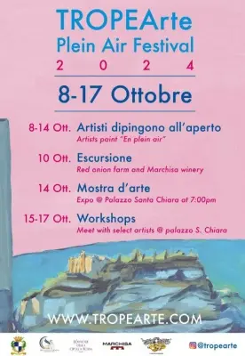 Per una settimana, artisti provenienti da tutto il mondo si riuniranno per dipingere e creare arte “Plein Air” (all’aperto) tra i vicoli stretti, le viste panoramiche e sulla spiaggia per catturare parte della bellezza della città di Tropea sulle loro tele. Il festival culminerà il 13 ottobre con una celebrazione e una esposizione di opere create durante la settimana. L’esposizione continuerà fino al 17 ottobre.