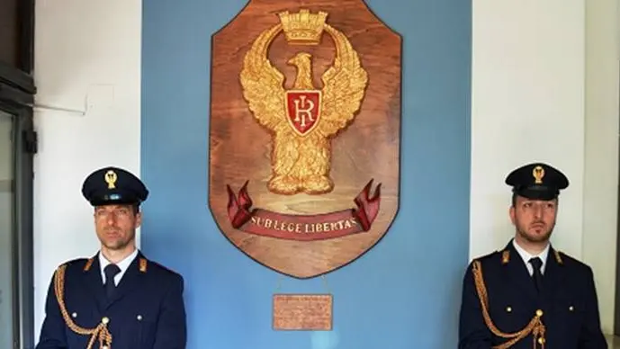 Realizzata in impasto semirefrattario in lamina d’oro montata su base di legno, l’opera riproduce l’aquila simbolo della Polizia di Stato con la scritta “Sub lege libertas”, motto che da 165 anni caratterizza l’attività dell’Istituzione.