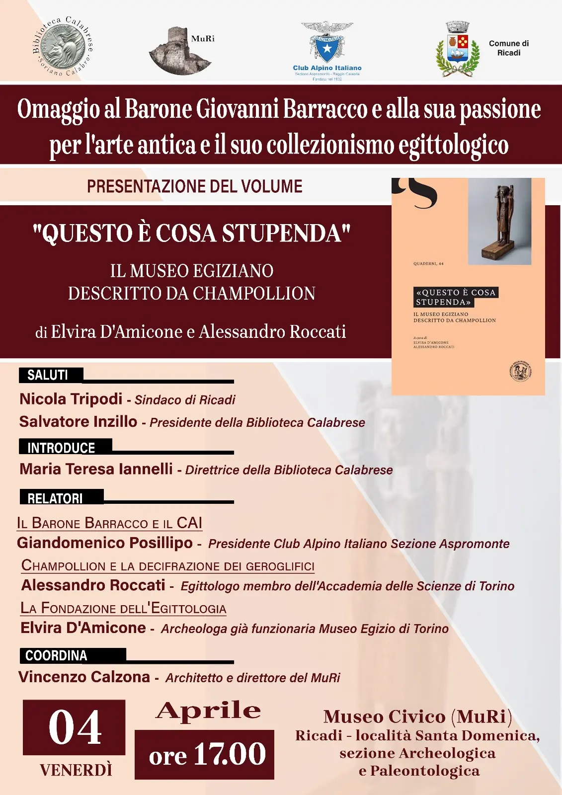 Il convegno si aprirà con la presentazione del volume “Questo è cosa stupenda. Il Museo egiziano descritto da Champollion”, curato da Elvira D’Amicone e Alessandro Roccati. D’Amicone ripercorrerà la fondazione dell’egittologia, mentre Roccati si concentrerà sulla figura di Champollion e sulla sua storica decifrazione dei geroglifici. Il volume celebra il bicentenario di questa impresa, ripercorrendo il soggiorno di studi di Champollion al Museo Egizio di Torino, tappa fondamentale per la conoscenza scientifica della civiltà egizia. La manifestazione renderà omaggio anche al barone Giovanni Barracco, illustre calabrese collezionista di antichità egizie e fondatore del Cai. Alessandro Roccati ne illustrerà il ruolo nel collezionismo ottocentesco, mentre Giandomenico Posillipo ne esplorerà il legame con il Club Alpino Italiano. Il direttore del Museo di Ricadi, Vincenzo Calzona, ha espresso «grande soddisfazione per la scelta del Museo come sede di una delle due manifestazioni calabresi – l’altra si terrà a Filadelfia il 5 aprile – dedicate al bicentenario della decifrazione dei geroglifici. Un riconoscimento importante per il Museo e per la Calabria – ha poi concluso Calzona -, che si conferma terra di cultura e di scoperte».
