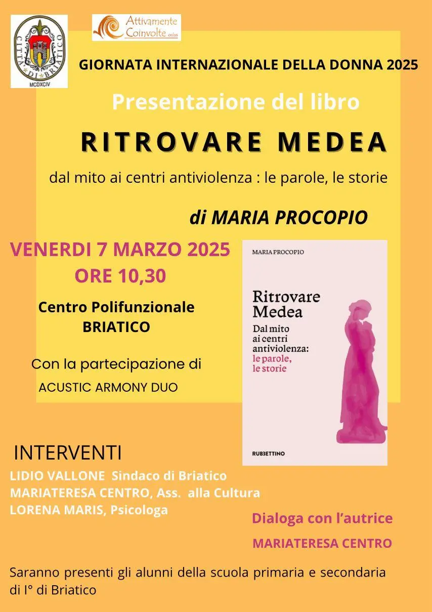 In occasione della Giornata internazionale della donna, il Comune di Briatico e l’associazione Attivamente coinvolte ha promosso la presentazione del libro “Ritrovare Medea. Dal mito ai centri antiviolenza: le parole, le storie” di Maria Procopio. L’appuntamento è in programma il 7 marzo, dalle ore 10.30 al Centro polifunzionale di Briatico. Prevista la partecipazione di Acustic armony duo. Agli interventi del sindaco Lidio Vallone, dell’assessore Mariateresa Centro, farà seguito il contributo della psicologa Lorena Maris. Alla mattinata culturale saranno presenti gli alunni della scuola primaria e secondaria di Briatico.