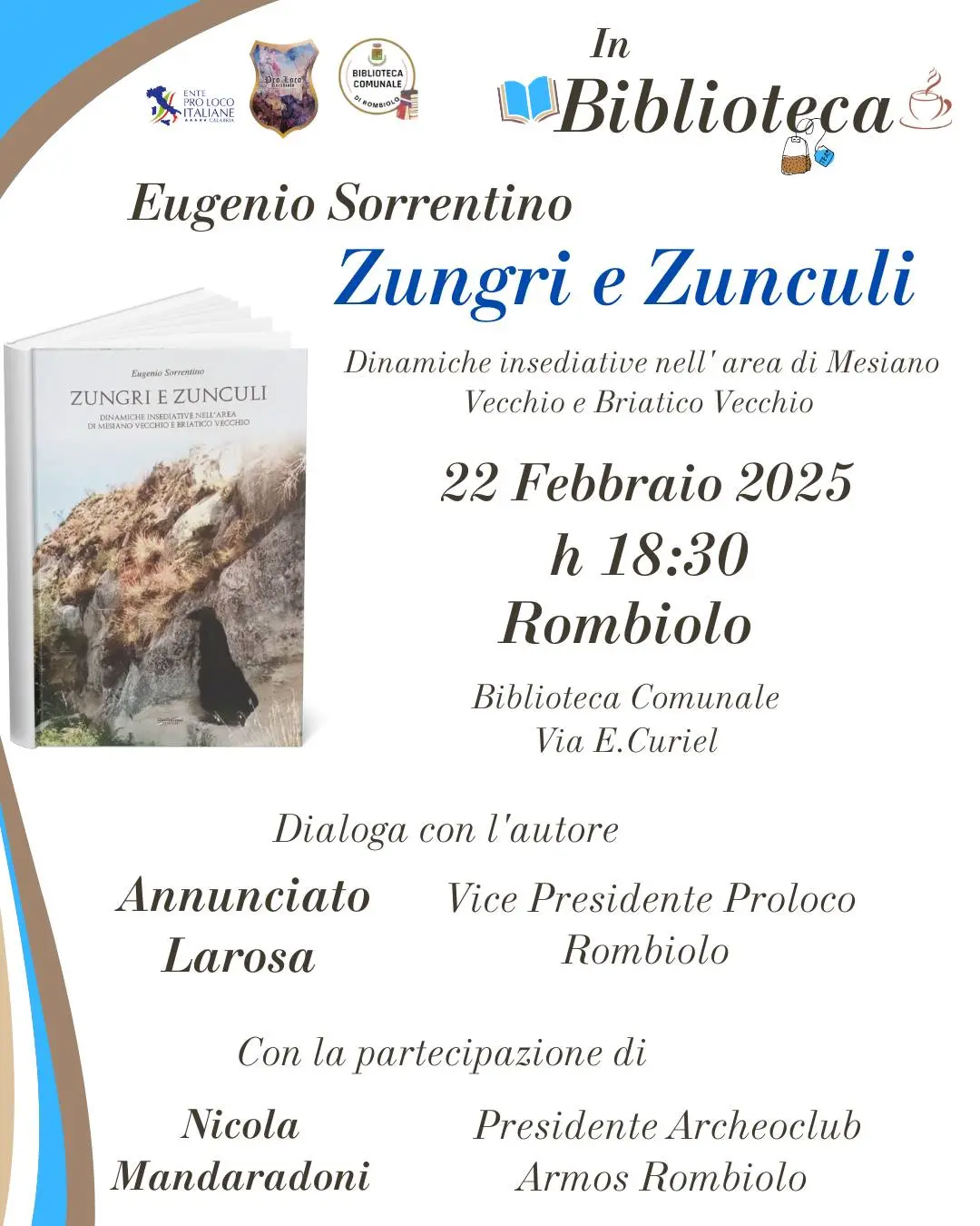 Tutto pronto, a Rombiolo, per l’evento conclusivo dell’annuale edizione di “In Biblioteca”, promossa dalla locale associazione turistica Proloco presieduta dalla fattiva Alessia Gerace. L’appuntamento è per oggi 22 febbraio, a partire dalle ore 18.30, all’interno dei locali della Biblioteca comunale, nei pressi della chiesa di San Michele. Protagonista della riuscita rassegna letteraria sarà, in questo caso, lo studioso Eugenio Sorrentino, autore del libro “Zungri e zunculi. Dinamiche insediative nell’area di Mesiano vecchio e Briatico vecchio”. Nell’occasione a dialogare con lo scrittore sarà il vicepresidente della locale Pro Loco, Annunciato Larosa. All’incontro interverrà e darà il suo contributo anche Nicola Mandaradoni, presidente dell’Archeoclub “Armos” di Rombiolo. Il libro di Sorrentino tratta non soltanto la storia di Zungri, suo paese natale, ma anche le dinamiche insediative di tutta l’area del Poro.