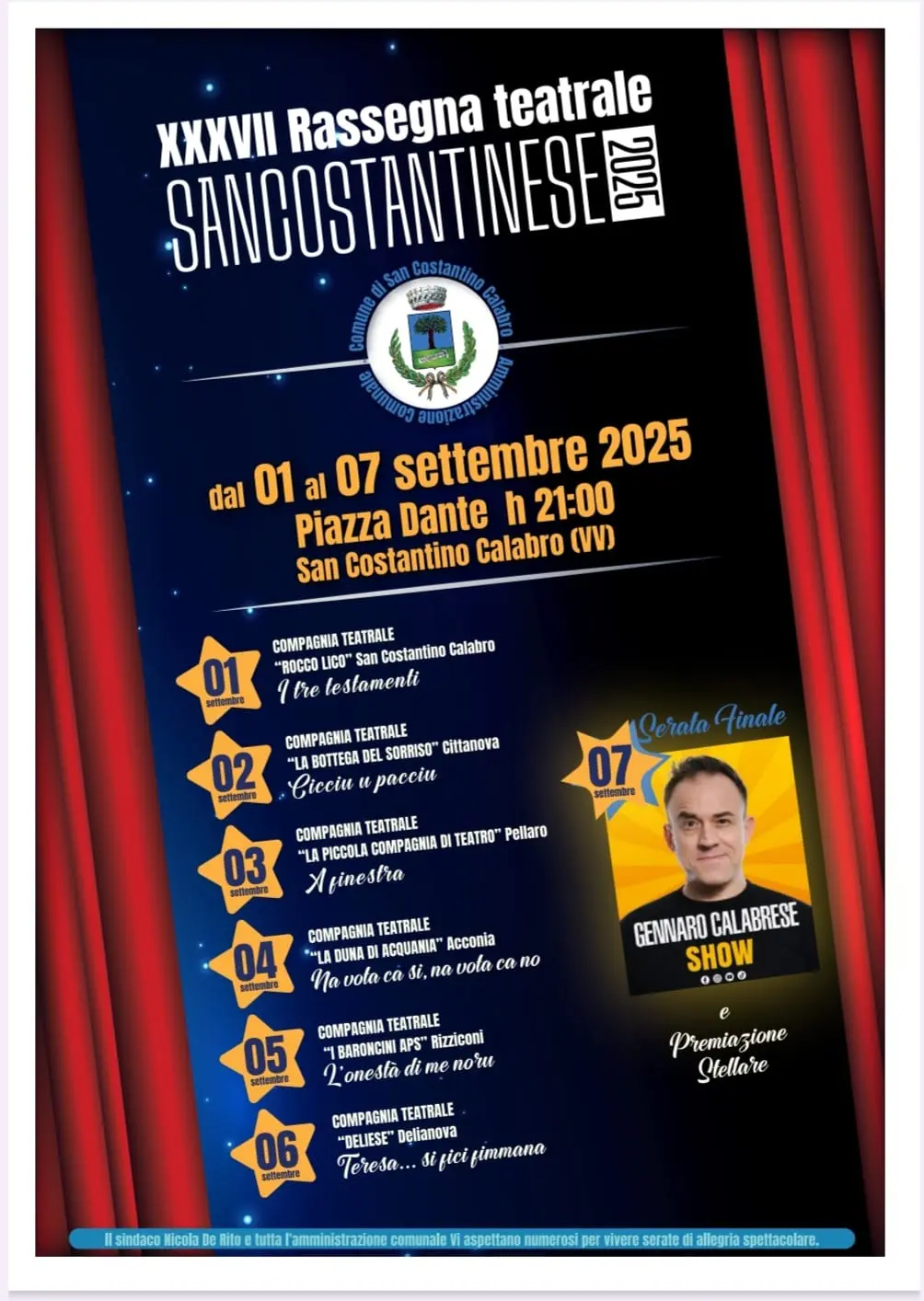 Ad aprire nella serata di oggi le “danze” ci penserà proprio la locale compagnia teatrale “Rocco Lico”, che dal palco allestito per l’occasione proporrà la commedia brillante “I tre testamenti”. Un gruppo di lunga tradizione, che, tra l’altro, è stato il vincitore della passata edizione della rassegna. Domani 2 settembre, invece, ad esibirsi sarà la compagnia teatrale “La bottega del sorriso” di Cittanova, pronta ad interpretare la commedia “Cicciu u pacciu”. L’articolato programma della manifestazione prevede, a seguire, mercoledì 3 settembre la proposizione della commedia “A finestra”, ad opera della Piccola compagnia di teatro di Pellaro, giovedì 4 settembre la performance della compagnia “La duna di Acquania” di Acconia, a sua volta protagonista della commedia “Na vota ca sì, na vota ca no”, venerdì 5 settembre l’esibizione dell’associazione teatrale-musico-culturale “I baroncini Aps” di Rizziconi, in questo caso pronta a deliziare il pubblico con la commedia “L’onesta di me noru”. Chiuderà il calendario 2025 delle rappresentazioni dialettali calabresi la compagnia teatrale “La Torre” di Torre Melissa, attesa sabato 6 settembre nell’opera “I tre disperati”. La XXXVII edizione della “Rassegna teatrale Sancostantinese” si concluderà domenica 7 settembre con lo show del cabarettista reggino Gennaro Calabrese, a cui seguirà la cerimonia di premiazione dei vincitori, in base alla classifica stilata dalla giuria di esperti.
