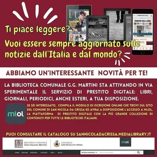 Leggere per conoscere, crescere e avere uno sguardo aperto sul mondo. San Nicola da Crissa punta alla lettura tramite un innovativo quanto sperimentale servizio di prestito digitale di libri, giornali, periodici anche esteri. L’informazione a portata di click è stata fortemente volita dalla Biblioteca Gian Giacomo Martini che, proprio nei giorni scorsi, ha lanciato il progetto. Per poter usufruire del servizio bisogna compilare il modulo di iscrizione disponibile on-line sul sito del Comune di San Nicola da Crissa. Tramite questo passaggio si potrà avere accesso a Mlol, la piattaforma di prestito digitale con la più grande collezione di contenuti per le biblioteche italiane. L’iscrizione alla biblioteca può essere richiesta anche dai non residenti o da chi abita all’estero. Il polo digitale conta più di 40 mila volumi (Giunti, Bompiani, De Agostini Libri, Edizioni Piemme, Einaudi, Mondadori, Rizzoli, Sperling & Kupfer, Feltrinelli e Adelphi) oltre a quasi 5 milioni di risorse open. Inoltre nell’edicola si potranno leggere gratuitamente numerosi quotidiani italiani e stranieri (anche tradotti), e tantissime riviste. Il progetto viene inizialmente attivato in via sperimentale per dieci utenti ma non è escluso che in futuro la platea dei beneficiari possa ampliarsi.