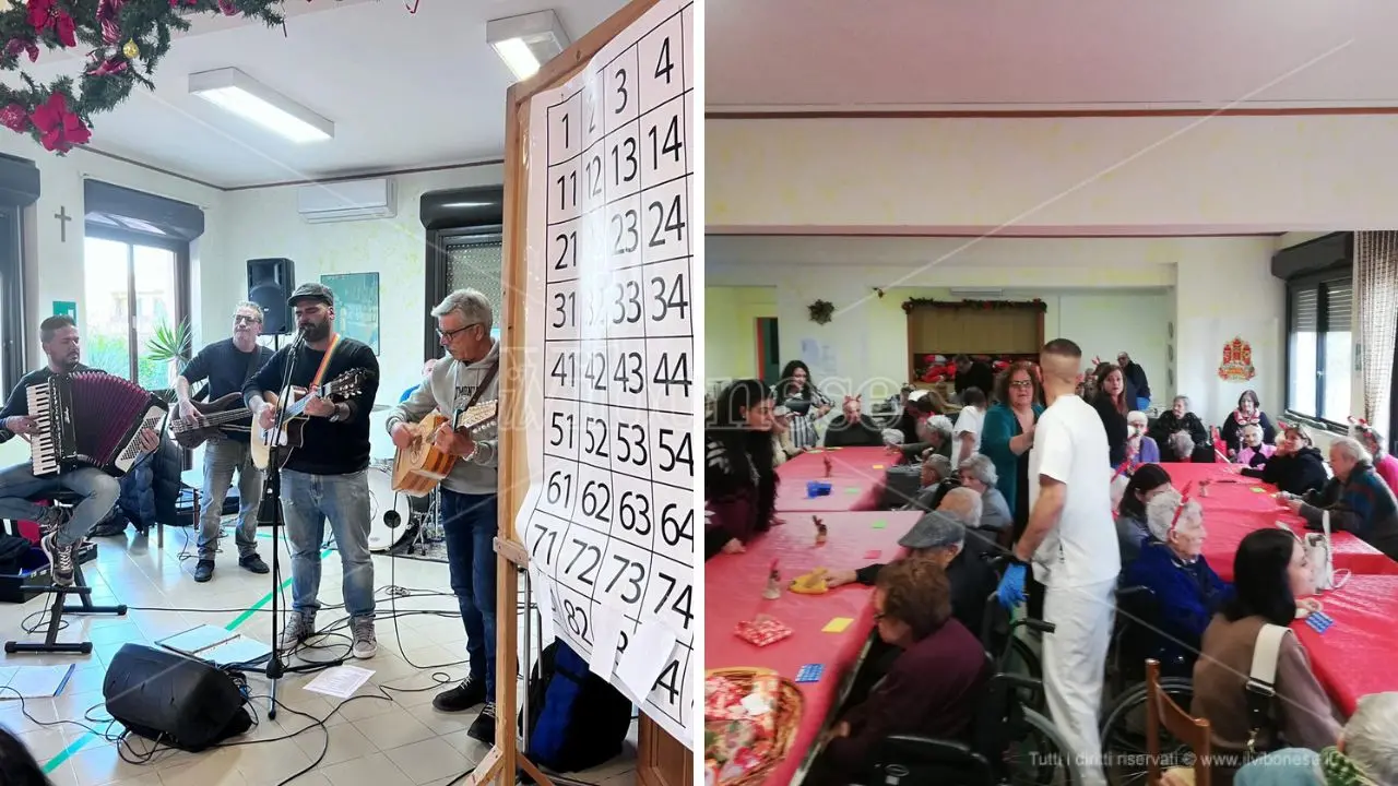 Un pomeriggio diverso, fatto di sorrisi e spirito natalizio, per gli anziani ospiti della Casa di riposo “Don Mottola” di Tropea. Il tutto grazie agli operatori socio sanitari e ai volontari che hanno organizzato per i degenti e le loro famiglie una tombolata di beneficienza, allietata dalle note del gruppo “Etno Pathos” che ha voluto omaggiare i presenti della propria musica popolare, regalando a tutti qualche ora di spensieratezza. «Vedere un sorriso stampato sul volto degli anziani ci ha davvero toccato il cuore – afferma il frontman del gruppo, Maurizio Pantano -. Queste persone racchiudono nella loro esistenza decenni di storia; sono i custodi della memoria di una terra che ha visto povertà, fame, catastrofi, guerre e tanto altro. Regalare un concerto a coloro i quali potrebbero essere i nostri genitori o i nostri nonni è stato veramente un grande onore». L’evento si è svolto con la partecipazione attiva degli ospiti. Il gruppo, infatti, ha voluto coinvolgere in prima persona alcuni di loro per conoscere le loro esperienze di vita. La signora Seconda, ad esempio, ha esordito spiegando il perché di quel suo nome curioso ed ha voluto intonare qualche verso delle canzoni d’amore che si cantavano a Drapia quando lei era adolescente. Il signor Matteo, invece, ha intrattenuto il pubblico raccontando che tanti anni fa partiva da Pizzo Calabro, dove era residente, per andare a fare l’operatore di macchina sulle navi a lunga percorrenza, per poi cantare Morandi e Ranieri a memoria. Maurizio Pantano, autore peraltro del brano “Trupia”, ultimo singolo dell’anno uscito il 16 giugno scorso con un video girato proprio nella cittadina tirrenica, ha quindi aggiunto: «Suonare la nostra musica è il modo migliore che conosciamo e che ci sentiamo di offrire a tutte quelle persone che vivono la loro quotidianità lontane dagli affetti più cari, con la speranza che possa contribuire ad alleviare le loro sofferenze. Un ringraziamento ed un augurio speciale a tutti i ragazzi che mettono a disposizione la loro umanità, oltre alla loro professione, per far vivere il Natale agli anziani della Casa Don Mottola come una grande famiglia».