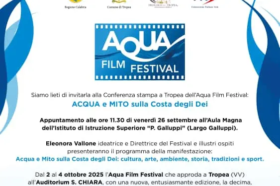 Tropea si prepara ad accogliere un evento culturale di prestigio: venerdì 26 settembre, alle ore 11.30, presso l’Aula Magna dell’Istituto di Istruzione superiore “P. Galluppi”, si terrà la conferenza stampa di presentazione della decima edizione dell’Aqua Film Festival, in programma dal 2 al 4 ottobre 2025 all’Auditorium “S. Chiara”.