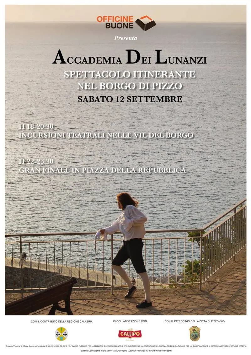 Il 12 settembre infine, a partire dalle 18, saranno messi in scena una serie di spettacoli itineranti per il centro storico di Pizzo. «Un progetto – come spiega Ugo Vivone, fondatore di Officine Buone – che innova il concetto di “guida turistica” e lo trasforma in un “turismo esperienziale”, modalità sempre più efficace per conoscere al meglio la vera essenza dei luoghi. Abbiamo unito in questo progetto due eccellenze del territorio calabrese: il gruppo Callipo, da sempre vicino alla nostra missione, e la bellezza dei luoghi di Pizzo, che saranno raccontati in maniera innovativa da Lunanzio, un personaggio di fantasia che guiderà gli attori coinvolti e il pubblico alla scoperta dei luoghi». [Continua]