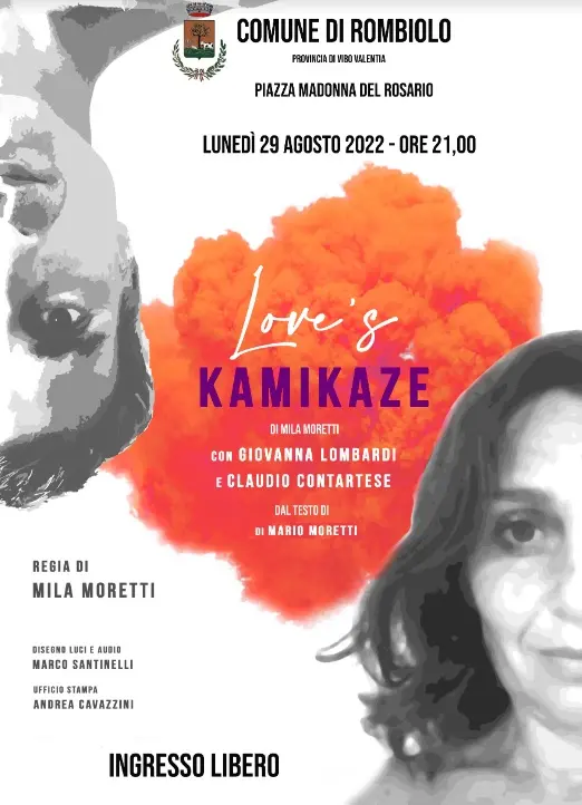 Interpretato da Giovanna Lombardi e Claudio Contartese, per la regia di Mila Moretti, il testo nasce da un’idea del padre Mario Moretti, drammaturgo, attore e regista teatrale, animatore di alcune fra le più fertili realtà teatrali e culturali italiane come il “Teatro Tor di Nona”, “Il Caffè Teatro” di Piazza Navona, il Teatro in Trastevere e nel 1982 con Lorenzo Salvati l’Accademia del Teatro dell’Orologio, dove ha ricoperto il ruolo di direttore artistico e docente di drammaturgia. Sua figlia Mila porta avanti con la stessa passione del padre la rilettura di questo testo, tristemente attuale, difendendo i Juliet and Romeo di sempre e per sempre. «Non possiamo sposarci, Naomi» sentenzierà amaramente Abdel e al gesto purificatore e idealista con cui lanciano il loro paradossale messaggio di pace: «Perché è sempre con i corpi che si scrivono le rivoluzioni!». Love’s kamikaze si innesta naturalmente nel fertile ceppo dell’attualità e dell’impegno civile, a dimostrazione che il teatro non racconta solo favole, ma può anche essere carne, viscere, sangue della nostra impietosa esistenza. E, soprattutto, può portare un mattone, una pietra, un granello di sabbia, per la costruzione dell’edificio della pace. Un’utopia? Perché no? Vengano pure le utopie, se ci aiutano ad uscire per qualche tempo all’aperto, fuori dal nostro bunker quotidiano. Inizio spettacolo ore 21. In caso di maltempo o di condizioni climatiche avverse, l’evento verrà spostato all’interno dell’Auditorium comunale.