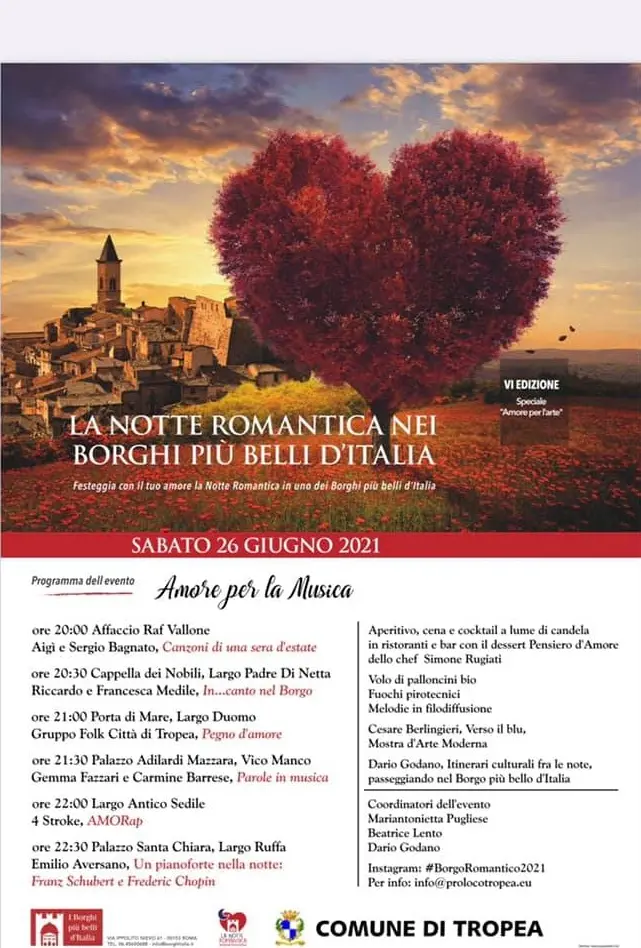 Tropea, recentemente insignita del titolo di “Borgo dei borghi”, vivrà un evento condiviso da tutte le località che fanno parte del circuito dei borghi più belli d’Italia. È la Notte romantica, manifestazione giunta alle sesta edizione e che, come da tradizione, si svolge il sabato successivo al solstizio d’estate. I dettagli sono contenuti in una nota stampa. [Continua in basso]
