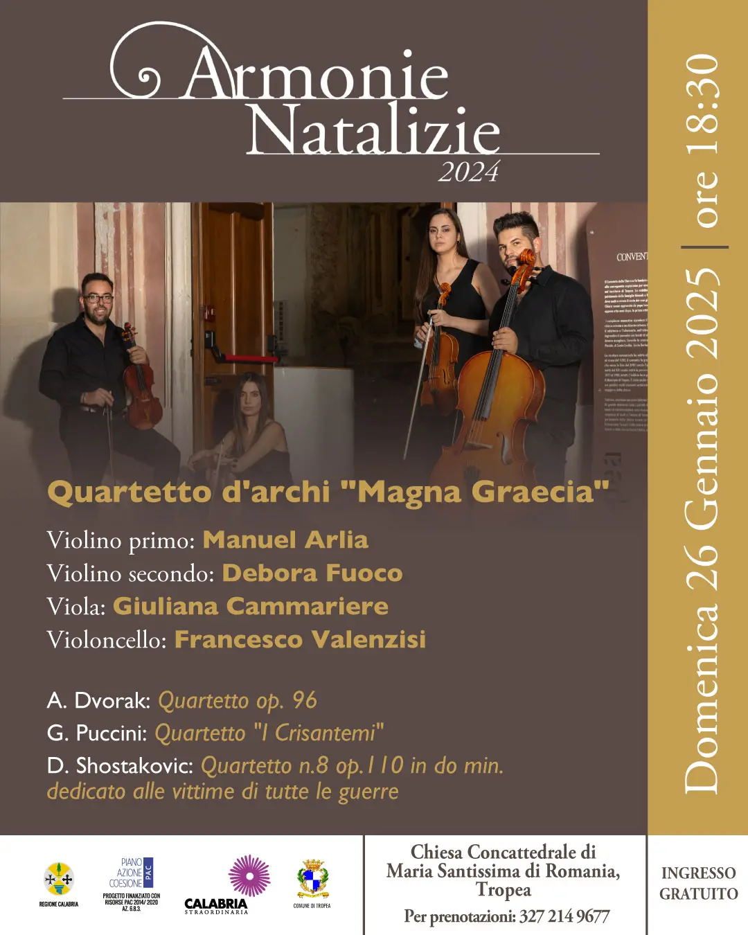Protagonista della serata è il rinomato Quartetto d’archi Magna Graecia, composto da Manuel Arlia (Violino primo), Debora Fuoco (Violino secondo), Giuliana Cammariere (Viola), Francesco Valenzisi (Violoncello).