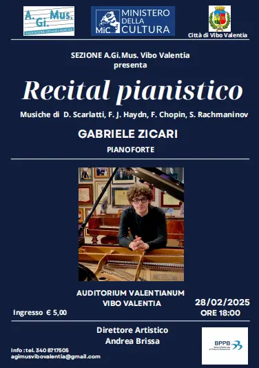 La sezione A.Gi.Mus. Vibo Valentia, impegnata a sostenere i giovani musicisti di talento del territorio calabrese, in particolare quelli provenienti da contesti svantaggiati, ha messo a punto la Rassegna concertistica 2025. Questa sera alle ore 18, all’Auditorium del Valentianum, si terrà il concerto del giovane pianista talento Gabriele Zicari. Il concerto, che gode del patrocinio del Mic e del Comune di Vibo Valentia, vedrà il giovane pianista calabrese esibirsi in brani dei grandi compositori della musica quali Scarlatti, Haydn, Chopin e Rachmaninov. l direttore artistico, Andrea Brissa, ha sottolineato l’importanza di «dare spazio ai giovani talenti, permettendo loro di condividere la loro passione, che include disciplina e sacrificio».