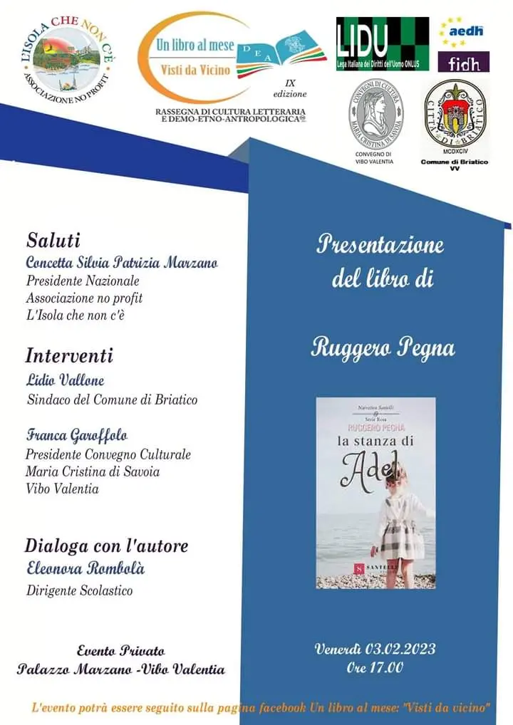 «Siamo la dimostrazione» ha detto la Marzano «che si possa essere primi, soprattutto quando si è in grado realmente di mettersi in gioco con la volontà di condividere progettualità senza altro fine che non sia la cultura». Ai suoi saluti, seguiranno quelli di Lidio Vallone, sindaco di Briatico e di Franca Garoffolo, presidente del Convegno Culturale Maria Cristina di Savoia Vibo Valentia, primi ad aderire al progetto già dallo scorso anno. Quindi il primo autore calabrese, Ruggero Pegna testimonial dell’associazione organizzatrice, con “La stanza di Adel”. A dialogare con l’autore la dirigente Eleonora Rombolà. Alcuni brani saranno letti dall’attore Giuseppe Ingoglia. Un libro denso di emozioni che darà la possibilità di trattare il delicato tema delle adozioni internazionali. Avrà quindi inizio la turnazione su più comuni e dal 10 febbraio l’evento, questa volta pubblico, si svolgerà nella nuova Biblioteca comunale di Briatico, mentre nella stessa data nuovi autori si muoveranno su Vibo e sugli altri comuni aderenti delle regioni che hanno sottoscritto il patto di collaborazione con l’associazione vibonese.