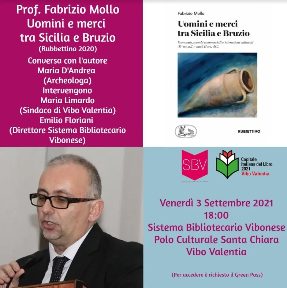 Venerdì 3 settembre, presso l’auditorium del Sistema bibliotecario vibonese, si terrà la conferenza del professor Fabrizio Mollo nell’ambito delle attività promosse dal Polo culturale di S.Chiara per Vibo Valentia Capitale del libro 2021. Presenterà il suo ultimo lavoro, uscito nel 2020, dal titolo Uomini e merci tra Sicilia e Bruzio. Economia, scambi commerciali e interazioni culturali (IV sec. a.C.- metà II sec. d.C.).