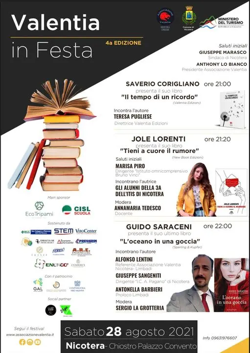 Dopo i saluti istituzionali del sindaco Giuseppe Marasco e del referente cittadino di Valentia Alfonso Lentini, Jole Lorenti presenterà il suo libro “Tieni a cuore il rumore”, in una chiacchierata con gli studenti dell’Itis “A. Russo” di Nicotera, con la dirigente Marisa Piro e con la professoressa Annamaria Tedesco. Alle 22.00 poi si terrà la presentazione del libro “L’oceano in una goccia” del professore universitario Guido Saraceni, che dialogherà con Sergio La Grotteria.