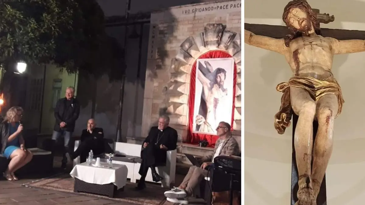 Un commento che ben sintetizza l’argomento dell’incontro, focalizzato proprio sul “Crocefisso di Dasà” e connotato da una doppia valenza: di carattere storico-artistico e religioso-spirituale. All’incontro – introdotto e moderato dal giornalista e scrittore vibonese Michele Petullà – hanno preso parte il vescovo della diocesi di Mileto-Nicotera-Tropea, monsignor Attilio Nostro, lo storico dell’arte ed esperto Mario Panarello, docente presso l’Accademia di Belle Arti di Lecce, lo stesso don Pasquale Rosano ed il parroco di Dasà, don Bernardino Comerci. A fare da corollario una piazza – dominata dall’imponente Monumento ai Caduti – gremita di un numeroso e attento pubblico, nonostante l’ora di inizio dell’incontro, che ha preso il via intorno alle 22:00. Tra il pubblico erano presenti anche il maestro d’arte Nicola Mazzitelli, autore del restauro a cui il Crocefisso è stato di recente sottoposto, e la dottoressa Daniela Vinci – sovrintendente alle Belle Arti, Archeologia e Paesaggio per la Città Metropolitana di Reggio Calabria e la provincia di Vibo Valentia –, la quale in chiusura, prima dell’intervento del vescovo, è intervenuta per un breve saluto, non mancando di offrire utili indicazioni e sensazioni sul tema trattato.