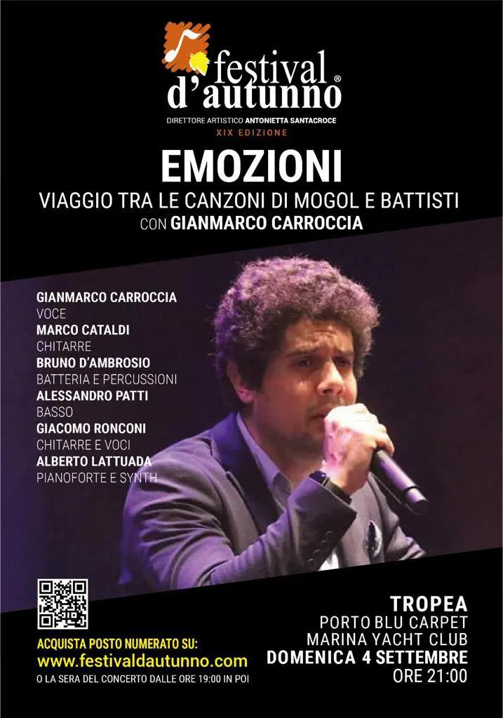 Canzoni e nostalgia, un binomio che segnerà il secondo appuntamento del Festival d’Autunno, diretto e ideato da Antonietta Santacroce. Domenica 4 settembre, alle ore 21, nel Porto Blu Carpet del Marina Yacht Club di Tropea, Gianmarco Carroccia con lo spettacolo ‘Emozioni. Viaggio tra le canzoni di Mogol e Battisti’, ci riporterà indietro nel tempo interpretando le canzoni della coppia di autori più amata dal pubblico italiano. Carroccia, in possesso di un aspetto fisico e una voce che ricordano molto da vicino Battisti, è dotato di una capacità interpretativa senza pari con cui riesce a cogliere tutte le sfumature delle canzoni di Poggio Bustone. Non solo interprete del repertorio battistiano, l’artista ha intrapreso un percorso di cantautore di successo, che lo ha portato ad incidere ‘Un vero amore’, singolo che sta ottenendo il giusto riconoscimento nelle radio italiane. [Continua in basso]