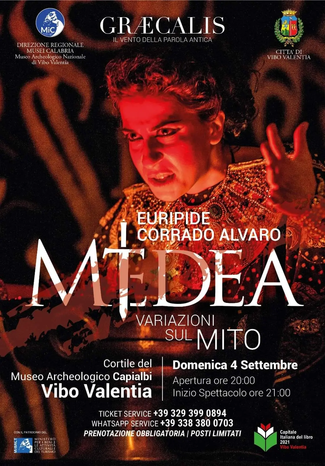 Giunge l’appuntamento forse più atteso della rassegna teatrale “Graecalis-Il vento della parola antica”, aperta lo scorso 24 luglio con l’“Agamennone” di Vittorio Alfieri. Domani 4 settembre, nell’ambito del ricco calendario di eventi proposto dal Museo archeologico nazionale “Vito Capialbi” di Vibo Valentia, in sinergia con il “Teatro Aroldo Tieri” e la locale Amministrazione comunale, nel cortile dell’antico maniero si terrà lo spettacolo “Medea. Variazioni sul mito”. Si può dire perfettamente centrato, a questo punto, l’obiettivo del direttore del museo, Maurizio Cannatà, e degli altri partner dell’iniziativa, di far rivivere i luoghi della memoria di Hipponion-Vibo Valentia nel modo ritenuto forse più congeniale, attraverso la rappresentazione teatrale, alla maniera degli antichi greci. «L‘ardimento e la passione di un’eroina senza tempo. In lei razionale e irrazionale coesistono, in uno sviluppo di sentimenti che la ragione è in grado di distinguere ma il cuore non riesce a superare. Istinto e furore, corpo e anima che amano fino all’autodistruzione – si legge in un post illustrativo dell’opera, inserito dalla realtà culturale del MiC afferente alla Direzione regionale Musei Calabria – un confliggere di elementi che il genio di Euripide ha trasformato in uno dei personaggi più straordinari della letteratura occidentale. Medea è una donna ferita nella sua dignità più intima. [Continua in basso]