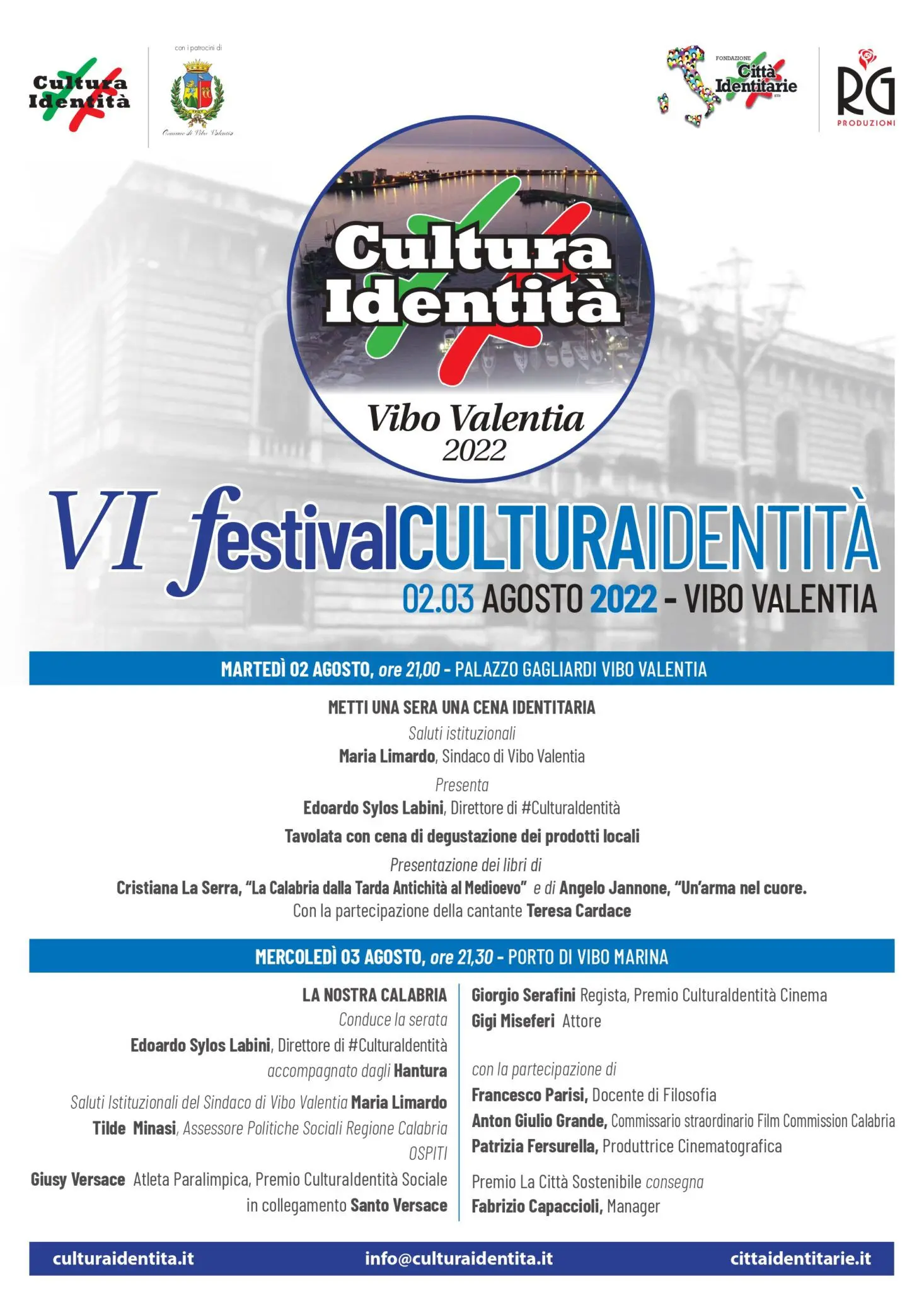 Si svolgerà stasera e domani, a Vibo Valentia, la VI edizione del Festival CulturaIdentità, con l’obiettivo di riscoprire l’identità locale e promuovere il patrimonio culturale, artistico ed enogastronomico della regione. In particolare questa sera, alle ore 21.00, il sindaco di Vibo Valentia, Maria Limardo, e l’assessore all’Innovazione Tecnologica, Michele Falduto, inaugureranno la serata, condotta dal direttore e fondatore di CulturaIdentità, Edoardo Sylos Labini. Palazzo Gagliardi farà da sfondo all’evento, con la presentazione del libro di Cristiana La Serra, “La Calabria dalla Tarda Antichità al Medioevo”, una ricostruzione del paesaggio rurale dell’Altopiano del Poro. In seguito verrà presentato il volume del manager ed ex ufficiale dell’Arma, Angelo Jannone, dal titolo “Un’arma nel cuore”, che racconta di un agente infiltrato nella mafia. Ad accompagnare Sylos Labini nella conduzione, la voce del soprano calabrese Teresa Cardace. [Continua in basso]