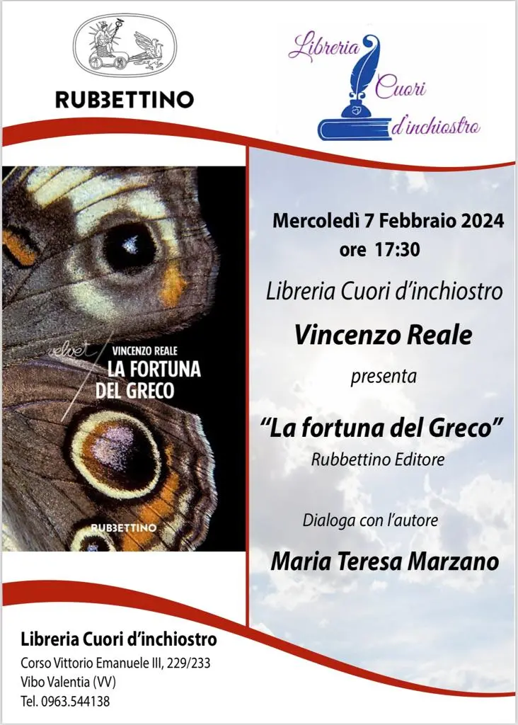 Mercoledì 7 febbraio alle ore 17:30 all’interno della libreria “Cuori d’inchiostro” di Vibo Valentia si terrà la presentazione di “La fortuna del Greco” romanzo di Vincenzo Reale, appena pubblicato da Rubbettino. “La fortuna del Greco”, ambientato in una Calabria lontana eppure vicina, è un romanzo di sopravvivenza e di speranza. La storia di un povero e umile muratore figlio di vaccari, sopravvissuto alla fame, alla guerra, a una faida, ad avventure e disavventure che sogna di costruirsi una casa e un futuro. Un racconto sincero, senza giudizi e pregiudizi e un affresco commosso e intenso della Calabria e dell’Italia. Vincenzo Reale, calabrese di seconda generazione, è nato a Grosseto, dove la famiglia originaria di Cittanova e Ciminà era emigrata negli anni ’80 dalla Locride alla ricerca di fortuna e lavoro e questo è il suo primo romanzo. A dialogare con l’autore ci sarà Maria Teresa Marzano.