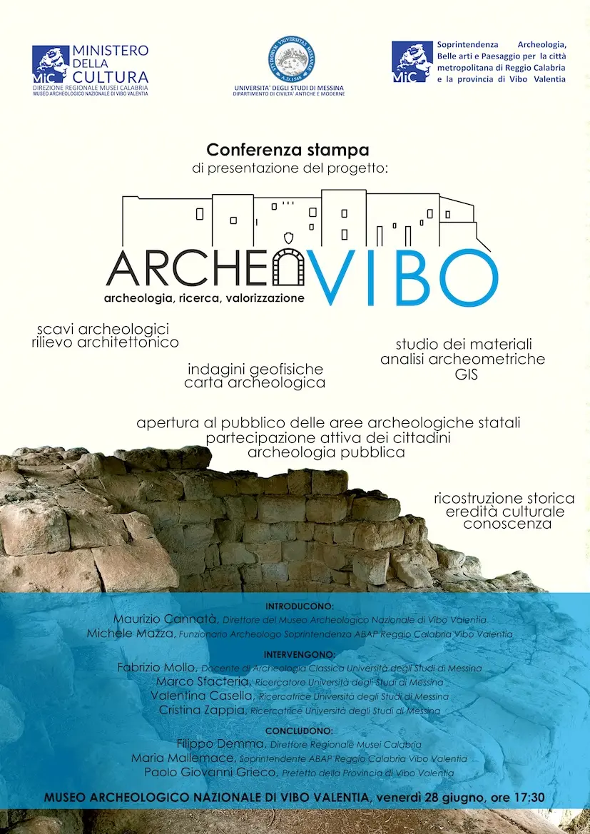 Venerdì 28 giugno al Museo archeologico nazionale di Vibo Valentia si terrà la conferenza stampa di presentazione del progetto “ArcheoVIBO”, un programma di studi e ricerche volto alla conoscenza e valorizzazione del vasto patrimonio archeologico vibonese. Frutto della collaborazione tra la direzione regionale Musei Calabria, la Soprintendenza archeologia belle arti e paesaggio per la città metropolitana di Reggio Calabria, la Provincia di Vibo Valentia e del dipartimento di civiltà antiche e moderne dell’Università degli studi di Messina. Il progetto si propone di fare luce sulla storia straordinaria di Vibo Valentia, antica Hipponion, e di valorizzare le sue aree archeologiche. Il prof. Fabrizio Mollo, docente di Archeologia classica presso l’Università di Messina, dichiara che: «Fare ricerca a Vibo è una grande opportunità per l’equipe e l’intero dipartimento, poiché permetterà di condurre un progetto di ricerca in chiave diacronica, partendo dalla Carta archeologica e studiando i contesti archeologici ancora da scoprire».