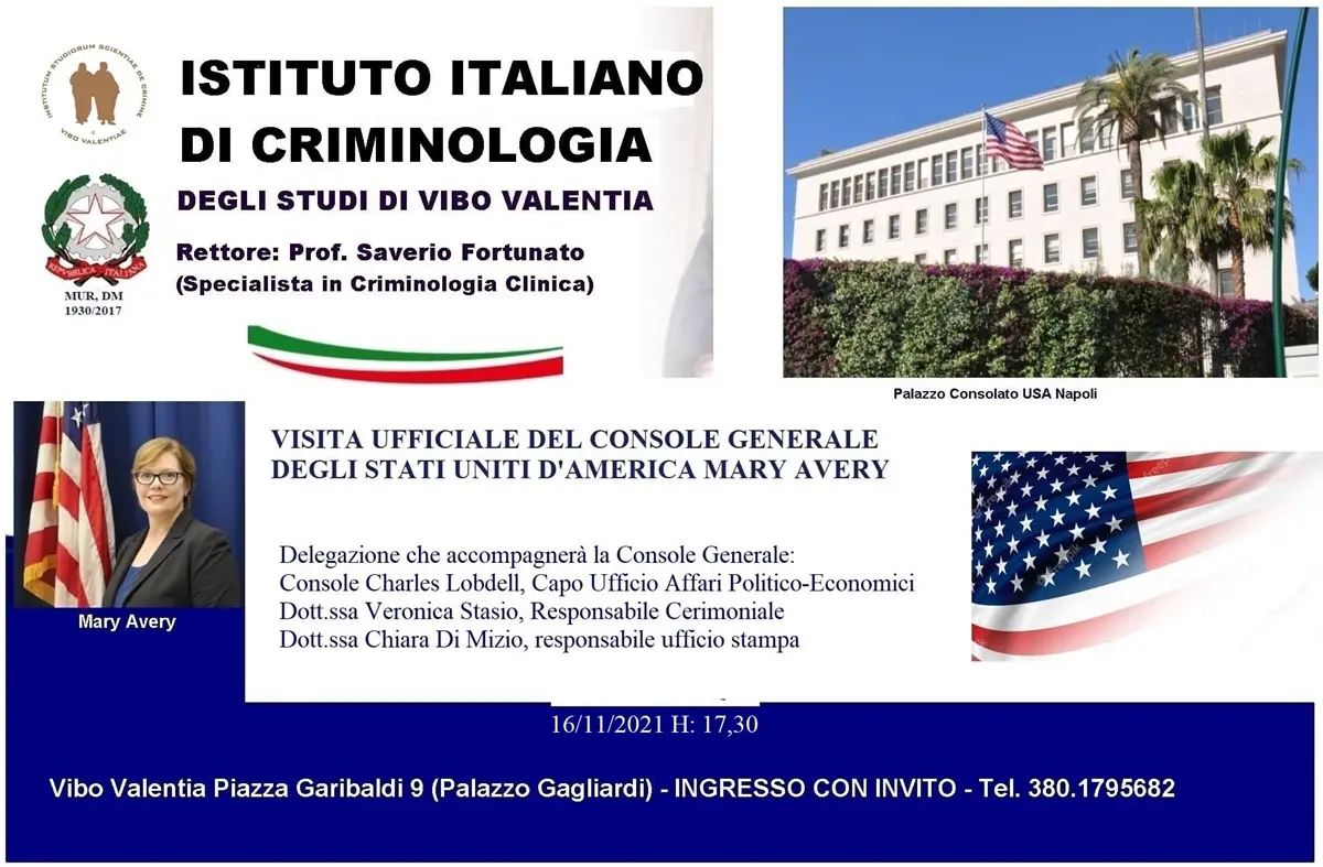 Il Console generale degli Stati Uniti d’America, Mary Avery, sarà domani a Vibo Valentia. Nello specifico, alle ore 17, è prevista una sua visita istituzionale presso l’Istituto italiano di Criminologia. «Si tratta – è spiegato in una nota – di un significativo incontro, che suggella le forti relazioni che intercorrono tra l’istituto vibonese, ad orientamento universitario, con le istituzioni governative americane presenti in Italia». [Continua in basso]