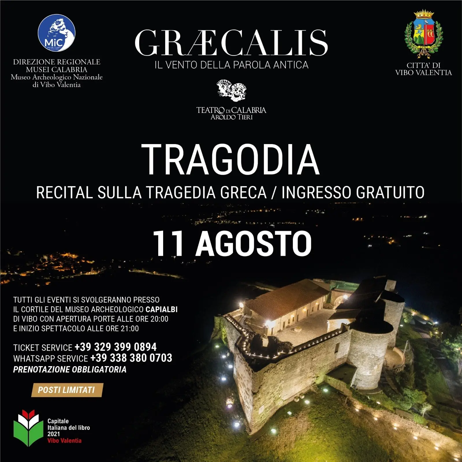 Prosegue il ciclo di eventi proposto dal Museo archeologico nazionale “Vito Capialbi” di Vibo Valentia, in sinergia con il “Teatro Aroldo Tieri” e la locale Amministrazione comunale. La realtà culturale, guidata dal direttore Maurizio Cannatà e incastonata nell’antico maniero che domina la città, sta ospitando nel periodo estivo un ricco calendario di eventi, nell’ambito della rassegna “Graecalis-Il vento della parola antica”. In questo contesto, stasera 11 agosto alle 21, tra le possenti mura volute dall’imperatore Federico II e i preziosi e antichi cimeli custoditi all’interno del museo, si terrà il recital sulla tragedia greca “Tragodia”. L’ingresso, in questo caso, è gratuito. L’apertura dei cancelli, per l’accesso al pubblico, è prevista alle 20. L’iniziativa tende a promuovere e a valorizzare le memorie archeologiche di Hipponion-Vibo Valentia nella maniera ritenuta, indubbiamente, più congeniale dagli stessi Greci: attraverso la nobile arte della rappresentazione teatrale. Un modo, tra l’altro, per far sì che la struttura MiC, afferente alla Direzione regionale Musei Calabria, ritorni ad essere a tutti gli effetti la casa del dramma antico. Iniziata lo scorso 24 luglio con l’“Agamennone” di Vittorio Alfieri, la rassegna teatrale proseguirà fino al prossimo 11 settembre, giorno in cui è previsto lo spettacolo su Trilussa, Pascarella e i sonetti romaneschi “L’arte del quotidiano”. Gli altri appuntamenti ancora in programma sono: lo spettacolo su Gabriele D’Annunzio “Quello che non fu fatto, io lo sognai” (21 agosto), la riproposizione del recital “Tragodia” (28 agosto) e le variazioni sul mito “Medea” (4 settembre).
