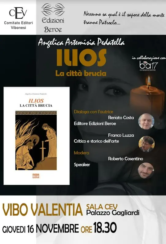 Il 16 novembre 2023 alle ore 18.30 presso la Sala Cev di Palazzo Gagliardi a Vibo Valentia avrà luogo una nuova tappa del libro “Ilios. la città brucia” di Angelica Artemisia Pedatella. L’evento è organizzato e presentato da Edizioni Beroe – Renato Costa, editore ed operatore culturale. L’occasione dà vita ad un dialogo profondo sul lascito culturale del mondo greco-omerico, con la rilettura struggente e sentimentale degli eroi che vissero la grande guerra di Troia e delle loro donne. «Raccontare l’Iliade è un fatto assolutamente contemporaneo – sottolinea l’autrice Angelica Artemisia Pedatella – e con questo libro ho cercato di dimostrarlo. I sentimenti che provano i personaggi antichi sono attuali e immortali, sono gli stessi che si provano nelle occasioni che il mondo dei social ci mette sotto gli occhi, che le risse tra giovanissimi per le strade della movida ci sollecita a confrontare con le zuffe omeriche… Le pulsioni, i desideri, le paure e gli errori non sono cambiati. Questa è stata la grande scoperta del lato più attuale di Omero e da questo ho potuto percepire la grande lezione che aveva da impartire ancora a questo mio mondo. Non ci scegliamo l’epoca in cui vivere, però possiamo scegliere in che modo vivere il tempo in cui ci troviamo immersi».