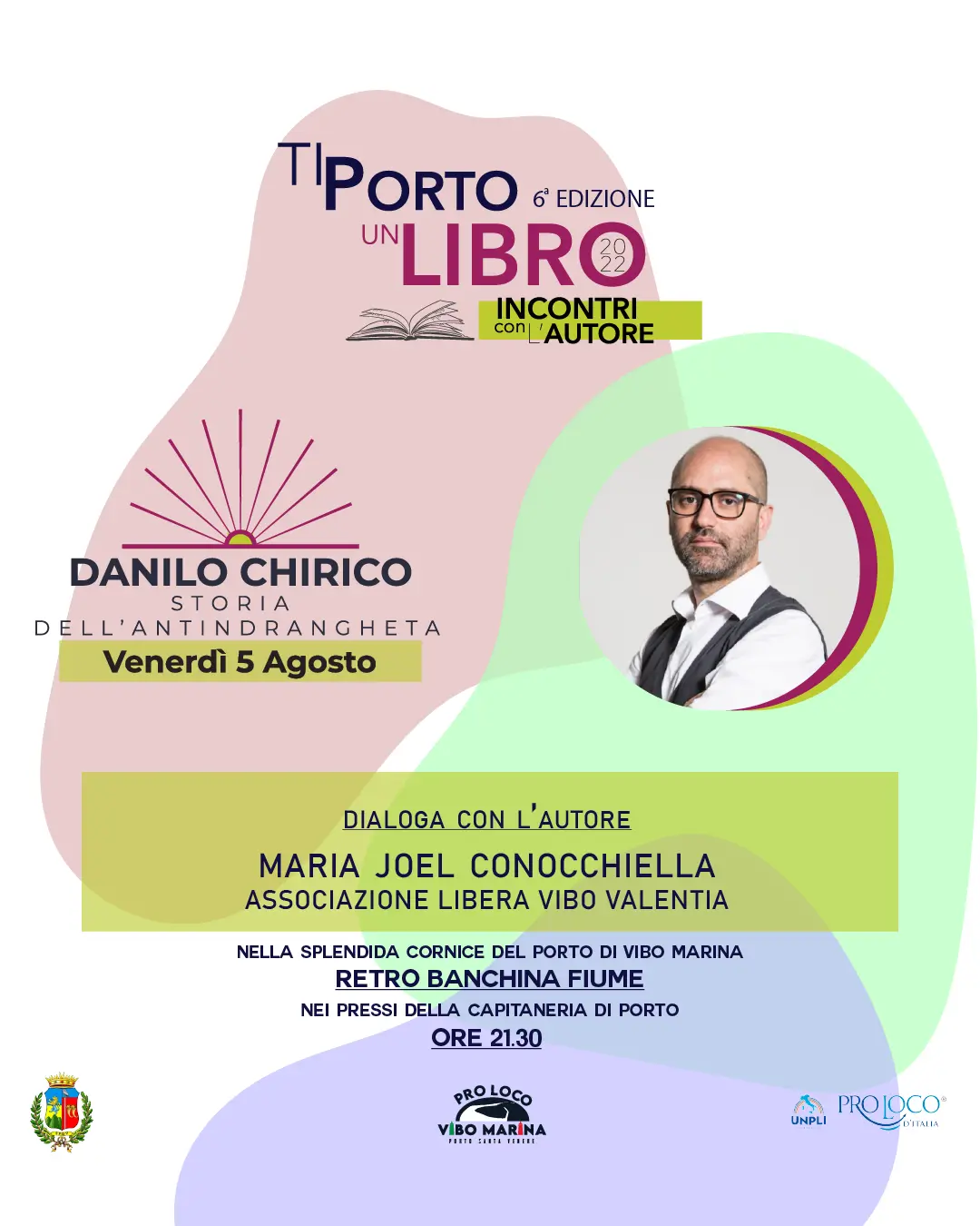 Nella serata di venerdì 5 agosto 2022 alle ore 21.30 a Vibo Marina, nel retro banchina Fiume vicino la Capitaneria di Porto, si svolgerà il terzo e penultimo incontro della VI edizione della rassegna “Ti porto un libro: incontri con l’autore”, organizzata dalla Pro Loco di Vibo Marina, con la collaborazione del Comune di Vibo Valentia. La terza serata vedrà come ospite Danilo Chirico, giornalista, scrittore e autore televisivo calabrese impegnato nella lotta alla ’ndrangheta come presidente dell’Associazione antimafie “daSud”.