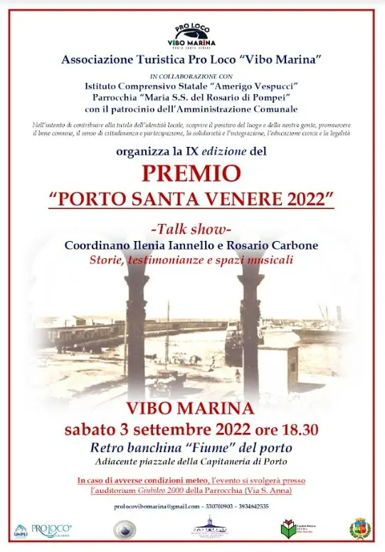 Sabato 3 settembre 2022, alle ore 18.30, – si svolgerà la IX edizione del “Premio Porto Santa Venere 2022” presso lo splendido scenario del porto di Vibo Marina – retro banchina Fiume, adiacente Capitaneria di porto – stesso luogo ove si son già tenuti gli incontri di “Ti porto un libro”. L’evento, ideato e organizzato dalla Pro Loco di Vibo Marina, in collaborazione con la Parrocchia Maria SS. del Rosario di Pompei, con l’Istituto Comprensivo statale “A. Vespucci” e patrocinato dall’Amministrazione comunale è ormai entrato nella tradizione della Comunità di Vibo Marina. Il Premio 2022 avrà al centro tre testimonianze esemplari di giovani del luogo, o legati in qualche modo al nostro territorio, che si sono distinti nella formazione e nel lavoro, nel recepire tradizione ed innovazione, nell’amore per la terra e per il mare, impegno sociale e la difesa dell’ambiente che si spera possano essere considerate da tutti, soprattutto quale proposta alle giovani generazioni. [Continua in basso]