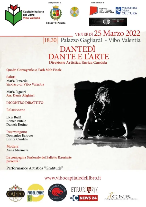 Nell’ambito della manifestazione “Vibo Valentia Capitale del Libro 2021” è in partenza la giornata del Dantedì, voluta dall’Assessorato alla Cultura di Vibo Valentia e realizzata dall’Associazione Artistica VeipoCam- Dance Vibo Dance Calabria di Vibo Valentia (rappresentata dalla maestra Enrica Candela) che, all’interno del suo programma “Vibo in Danza 2022”- alla sua decima riedizione, presenta il programma “Dante e l’Arte”. L’appuntamento avrà luogo alle ore 18 e 30 di giorno 25 marzo, presso Palazzo Gagliardi di Vibo Valentia. [Continua in basso]