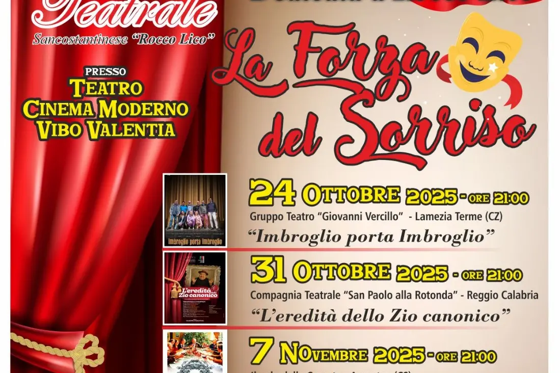 Il calendario della seconda edizione de “La forza del sorriso” propone, a seguire, il 31 ottobre la commedia brillante “L'eredità dello zio canonico”, a cura della compagnia teatrale “San Paolo alla rotonda” di Reggio Calabria, il 7 novembre l'opera teatrale “Parenti serpenti” de “Il volo delle comete” di Amantea, il 14 novembre la commedia “A mala sorti i me soru” della compagnia “I baroncini Aps” di Rizziconi. La rassegna teatrale 2025 dedicata a Rocco Lico si concluderà il prossimo 21 novembre con la commedia brillante “I tre testamenti”, proposta proprio dalla compagnia di San Costantino Calabro che oggi porta il suo nome e di cui è stato socio fondatore e dagli stessi attori che per anni hanno calcato insieme a lui i palcoscenici della Calabria, e non solo.