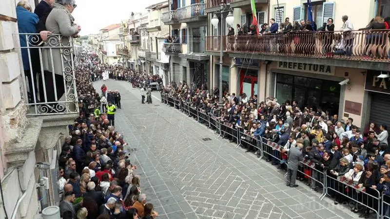 Il tempo incerto e il cielo uggioso non hanno scoraggiato la folla, giunta anche da diversi centri limitrofi, e la rappresentazione si è così potuta svolgere regolarmente. Analoghe iniziative, al culmine della Settimana santa, si sono tenute in molti altri centri della provincia dove, seppur con qualche significativa variazione, è andato in scena il medesimo canovaccio con le statue portate a spalla da fedeli estratti a sorte o, come nel caso del capoluogo, dai rappresentanti delle congreghe.