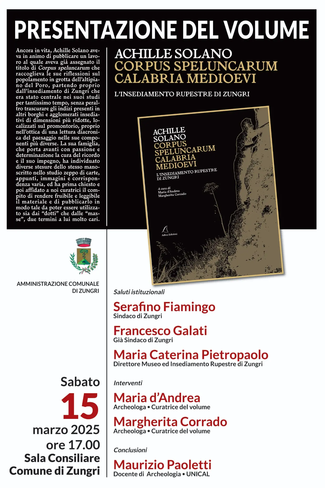 Solano aveva progettato di pubblicare un lavoro intitolato “Corpus speluncarum”, raccogliendo le sue riflessioni sul popolamento in grotta dell’altipiano del Poro, con un focus centrale sull’insediamento di Zungri. Nonostante non sia riuscito a pubblicarlo in vita, esistono diverse stesure del manoscritto nel suo studio. La famiglia ha affidato alle archeologhe Corrado e D’Andrea il compito di ordinare, classificare e rendere fruibile questo materiale. Il risultato è il volume che verrà presentato a Zungri, che mira a rendere accessibile il lavoro di Solano sia agli esperti che a un pubblico più ampio.