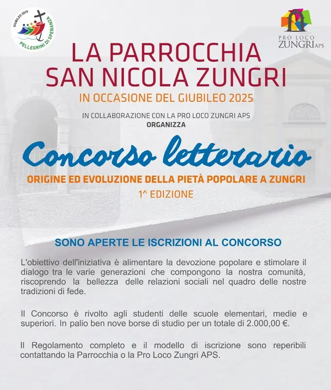 Il progetto “Le radici religiose e identitarie della comunità di Zungri”, tuttavia, non si ferma qui. Nell’ambito dello stesso percorso, infatti, viene proposta anche la prima edizione del Concorso letterario “Origine ed evoluzione della pietà popolare a Zungri”, quest’anno incentrato sul tema “La devozione popolare al tempo dei nostri nonni”. L’obiettivo è alimentare questo tipo di espressione religiosa e stimolare il dialogo tra le varie generazioni, riscoprendo la bellezza delle relazioni sociali nel quadro delle tradizioni locali di fede. Il bando è riservato esclusivamente agli studenti che risiedono nel comune di Zungri e frequentano, anche in altri comuni, le scuole primaria o secondaria di Primo e Secondo grado. Esso si divide in tre sezioni, la A riservata agli alunni di scuola elementare, la B a quelli di scuola media, la C agli studenti delle scuole superiori di Secondo grado. La partecipazione al concorso è gratuita e avverrà, secondo le modalità previste, attraverso la presentazione di un componimento sul tema prescelto, da effettuare entro e non oltre le ore 18 del prossimo 18 maggio. Solo gli alunni della scuola elementare potranno scegliere di proporre in alternativa un disegno, sempre attinente allo stesso argomento. A decretare i vincitori delle singole sezioni sarà un’apposita giuria designata dagli organizzatori. In palio nove borse di studio per un totale di 2mila euro. La cerimonia di premiazione avrà luogo entro il prossimo 14 giugno.