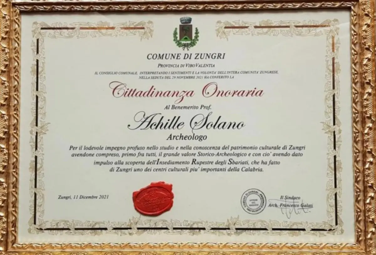 Il nome dell’archeologo Achille Solano si lega indissolubilmente alla storia di Zungri. Il Comune, rappresentato dal sindaco Franco Galati, ha conferito la cittadinanza onoraria alla memoria del professore originario di Nicotera, come segno di gratitudine per il grande contributo dato allo studio ed alla conoscenza del patrimonio storico-archeologico del territorio di Zungri. [Continua in basso]