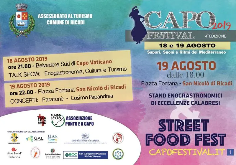 La seconda serata, quella di lunedì 19 agosto, si svolgerà in piazza a San Nicolò con i concerti dei Parafonè e di Cosimo Papandrea, nonché con la Street food fest e gli stand dei prodotti enogastronomici della Calabria. L’evento gode del patrocinio di diversi enti: Regione Calabria, Flag dello Stretto Area Tirreno 2, Unindustria Calabria, Camera di Commercio di Vibo Valentia, Slow Food Calabria, Accademia delle Tradizioni Enogastronomiche della Calabria, Touring Club Calabria. «L’intento – ha dichiarato il vicesindaco di Ricadi Patrizio Cuppari, presentando l’evento – è quello di coniugare l’attrattiva turistica del nostro territorio alle tradizioni gastronomiche e ai prodotti tipici, nell’obiettivo di indirizzare la nostra offerta verso un pubblico che ormai va sempre più alla ricerca di esperienze enogastronomiche di qualità».