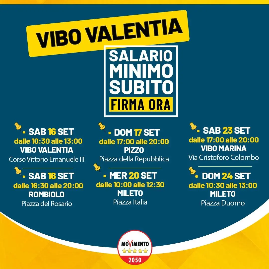 Si terrà domani dalle ore 10:30 alle 12:30 a Vibo Valentia su corso Vittorio Emanuele III il prossimo banchetto per la raccolta firme sul Salario minimo alla presenza degli Attivisti pentastellati, e nel corso della mattinata anche dei parlamentari Riccardo Tucci e Anna Laura Orrico. “Saranno diversi gli appuntamenti in tutta la provincia nel mese di settembre, per la raccolta firme della petizione popolare ai sensi dell’art.50 della Costituzione, – fanno sapere dal M5S – che è diventata indispensabile per smuovere il Governo Meloni, che ha messo nel cassetto la nostra proposta di legge, e così imporre un limite di legge alla paga oraria minima dei lavoratori e dare dignità a chi oggi viene pagato a meno di 3-4 euro l’ora. Siamo uno dei pochi Paesi rimasti in Europa a non avervi ancora provveduto”.