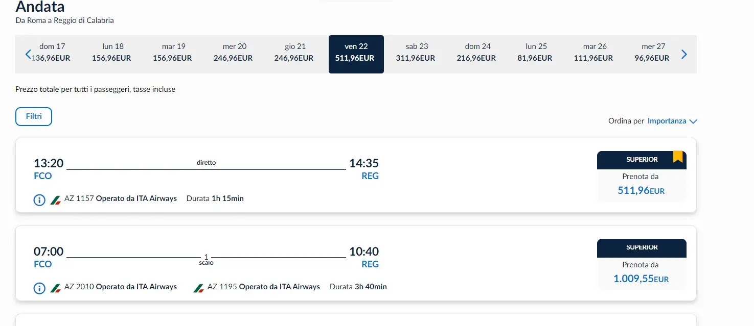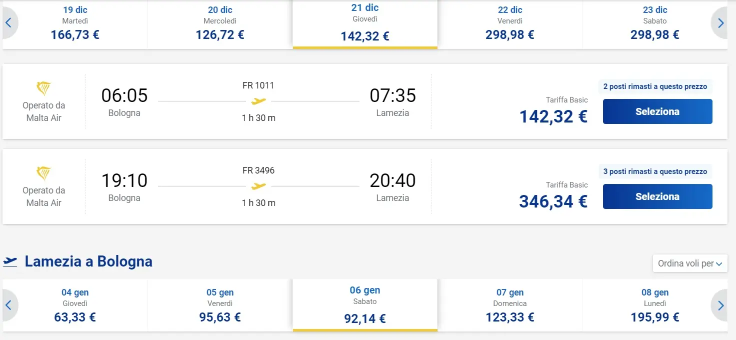 Per chi desidera raggiungere le località del Vibonese, l’aereo rientra tra i mezzi relativamente più veloci per i rientri. Considerata la vicinanza con l’aeroporto di Lamezia, è proprio lo scalo catanzarese il più gettonato. Con compagnia low cost, un volo Bologna-Lamezia, per la giornata del 21 dicembre e prenotato circa due settimane prima del Natale, costa (in base all’orario del viaggio) dai 140 ai 350 euro. Più “economico”, si fa per dire, la tratta da Malpensa. I prezzi oscillano dai 140 ai 160 euro nelle medesime date.