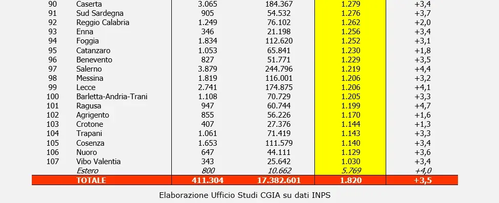 Il rapporto evidenzia: «Nel 2023 il monte salari lordo erogato ai 17,3 milioni di lavoratori dipendenti privati presenti in Italia ha toccato i 411,3 miliardi di euro: equivalenti ad una retribuzione media mensile lorda di 1.820 euro, il 3,5 per cento in più rispetto al 2022, anche se l’inflazione, sempre l’anno scorso, è cresciuta molto di più, per l’esattezza il 5,7 per cento. Va segnalato, infine, che oltre il 60 per cento dell’ammontare complessivo delle retribuzioni erogate nel Paese sono state pagate ai lavoratori del Nord».