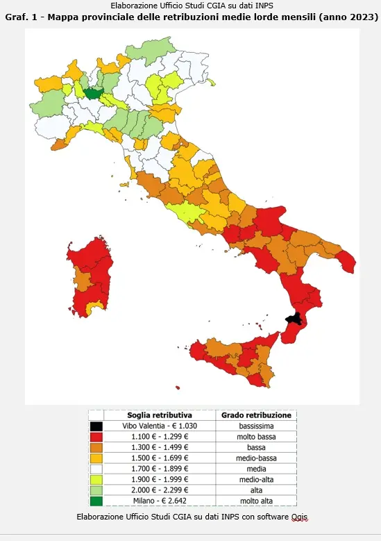 Stipendi più sostanziosi per chi lavora al Nord. Nel dettaglio, «le differenze retributive tra i lavoratori dipendenti privati del Nord e i colleghi del Sud sono evidentissime: se i primi percepiscono una busta paga di circa 2mila euro lordi al mese, quella dei secondi, invece, sfiora i 1.350». È quanto emerge da un’analisi condotta dall’Ufficio studi della Cgia. Maglia nera, Vibo Valentia, agli ultimi posti della classifica. Ma andiamo con ordine.