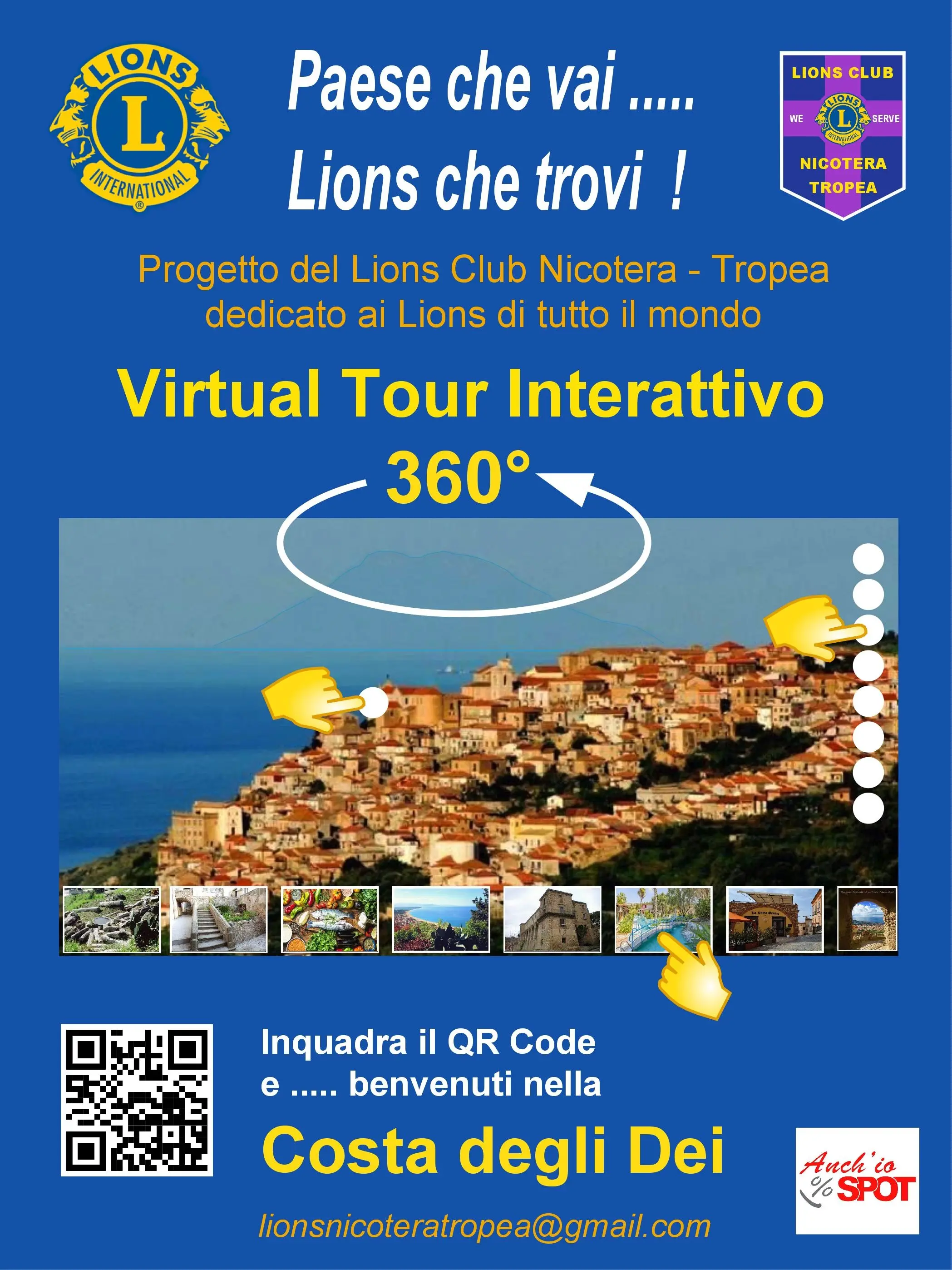 Il Lion Club di Nicotera e Tropea è lieto di presentare il “Virtual tour interattivo” finalizzato alla conoscenza del territorio di sua pertinenza che comprende la “Costa degli Dei” ed i territori dell’altopiano del Poro: «È un itinerario virtuale a 360°, messo a disposizione principalmente per i turisti Lions ed invogliarli ad assaporare anticipatamente il nostro territorio, certi che troveranno i nostri Clubs ad accoglierli e guidarli durante la loro permanenza», spiegano i promotori. Per accedere basterà inquadrare il QRCode dedicato o in alternativa cliccare su apposito link (clicca qui). «Nel solo territorio italiano – aggiungono – ci sono 1.300 Club Lions e 48.000 iscritti a cui questo messaggio è dedicato, senza voler considerare il resto del mondo Lionistico, con 1,4 milioni di soci».