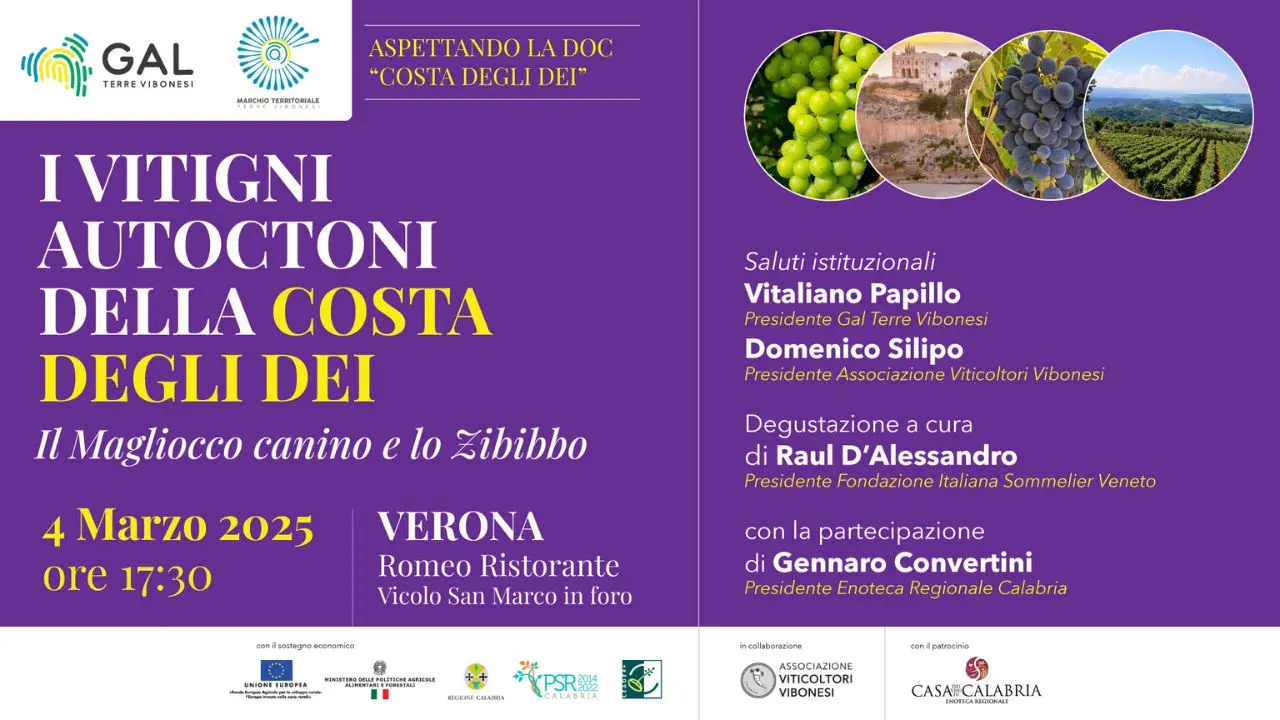 Il primo appuntamento di questo progetto sarà a Verona il 4 marzo 2025 con una masterclass aperta su prenotazione ad operatori del mondo della ristorazione e della stampa enogastronomica curata dal presidente di Fondazione italiana sommelier Veneto, Raul D’Alessandro, con la partecipazione di Gennaro Convertini, presidente della Enoteca regionale Calabria. Ad introdurre l’evento ci sarà il presidente del Gal Terre Vibonesi, Vitaliano Papillo, che approfondirà il senso e la portata della missione veronese dei viticoltori che sarà bissata, il 7 aprile, da un secondo evento nel cuore della città scaligera proprio in concomitanza con l’edizione 2025 del Vinitaly. Focalizzerà invece la realtà enologica del vibonese, il lavoro di valorizzazione e tutela del Magliocco canino e dello Zibibbo e le tecniche produttive, il presidente dell’associazione dei viticoltori, Domenico Silipo.