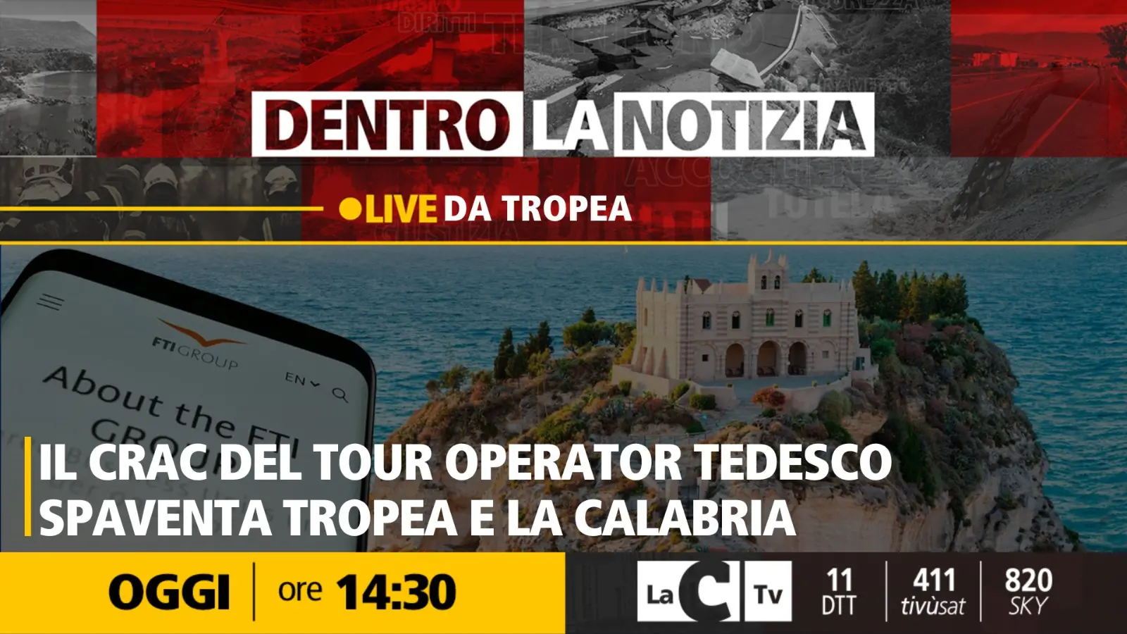 Il fallimento di FTI Touristik, il secondo tour operator tedesco e il terzo in Europa, continua a preoccupare. Particolarmente allarmati gli albergatori calabresi, specie nella Costa degli dei dove il turismo straniero e in particolare quello tedesco rappresentano una fetta importante ogni estate. Il crollo del colosso turistico come influirà sulle prenotazioni e sugli investimenti già pianificati per l’intera stagione? Ne parleremo nel corso della puntata odierna di Dentro la Notizia, in onda a partire dalle ore 14:30 su LaC Tv. In studio Pier Paolo Cambareri, inviata da Tropea Cristina Iannuzzi che avrà come ospite l’operatore turistico Gianni Imparato. In collegamento anche Sergio Stumpo, esperto in pianificazione turistica internazionale.
